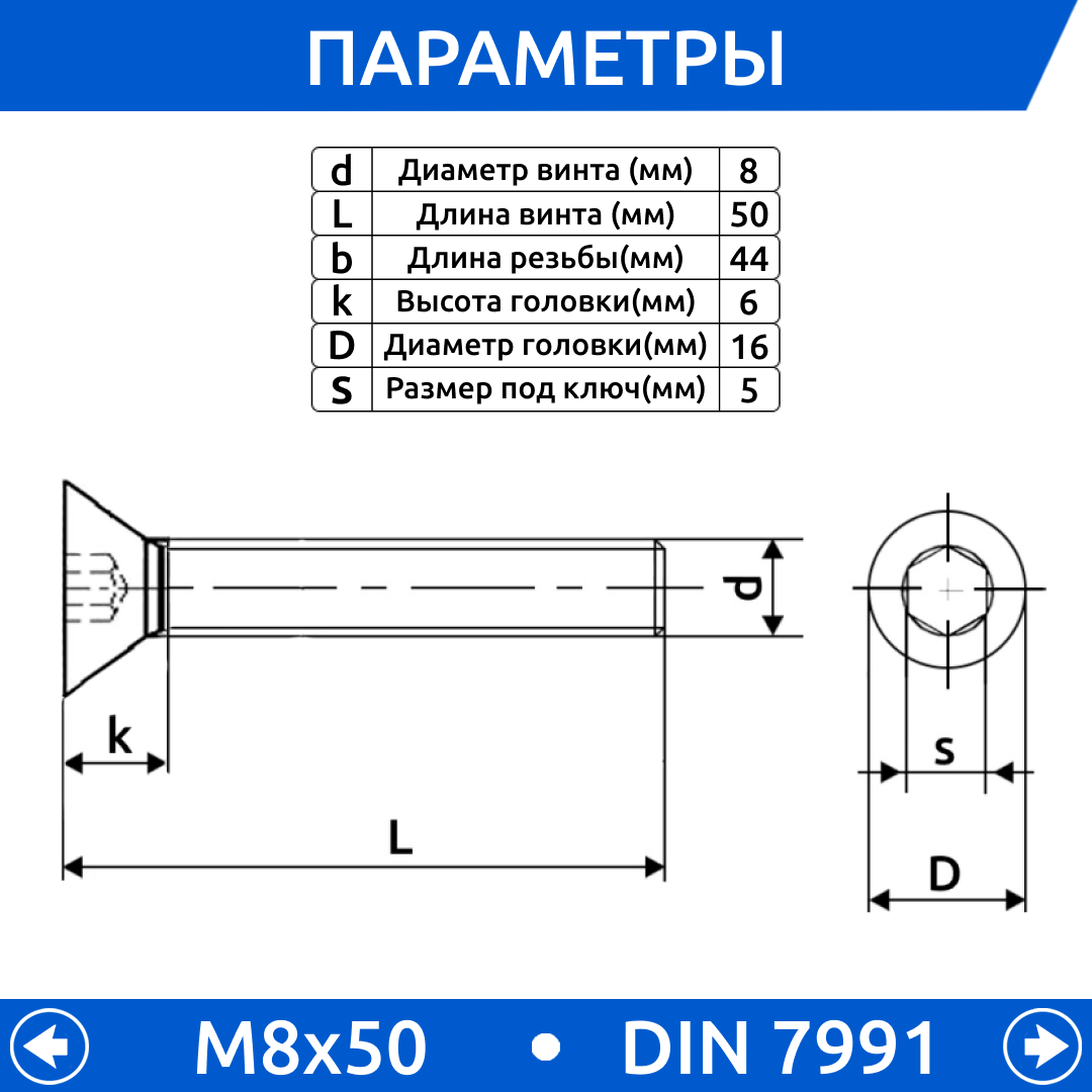 Отзывы на Винт нержавеющий М 8х50 с потайной головкой и внутренним шестигранником DIN 7991 А2, 5 шт
