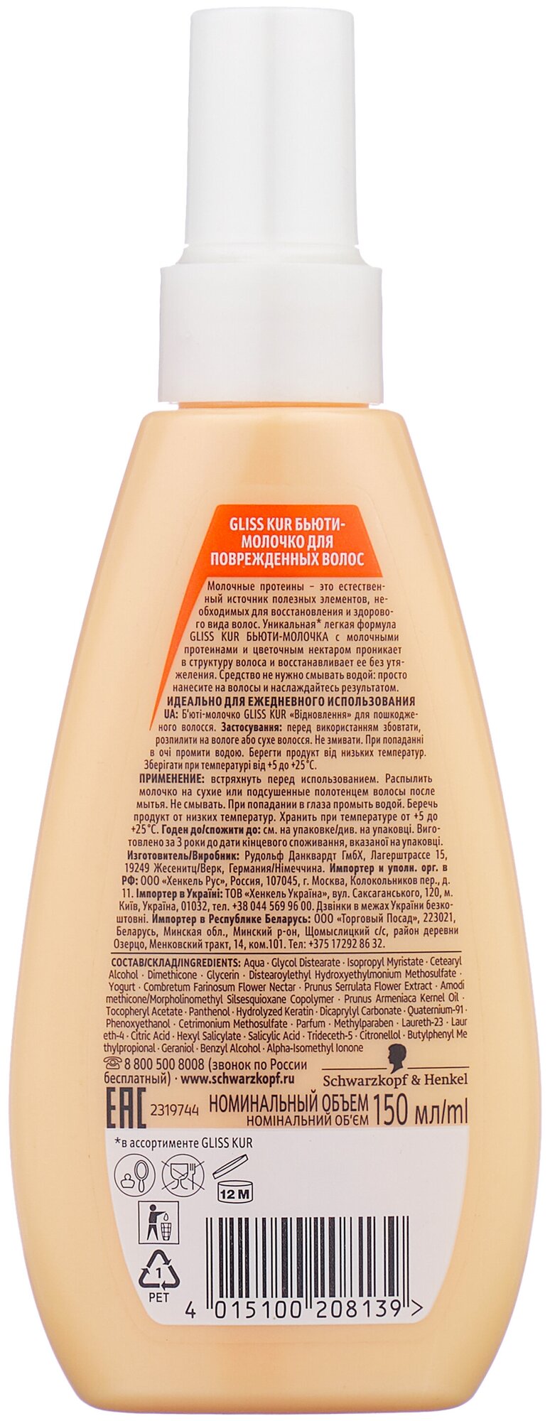 Gliss Kur Бьюти-молочко Восстановление для волос и кожи головы, 150 мл, спрей информация:
