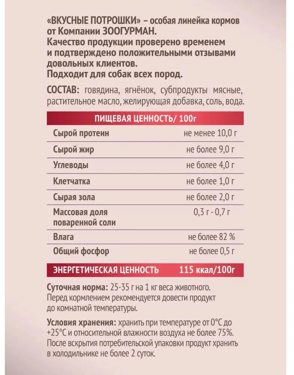 Зоогурман консервы для собак Вкусные потрошки Телятина с ягненком 350г информация:
