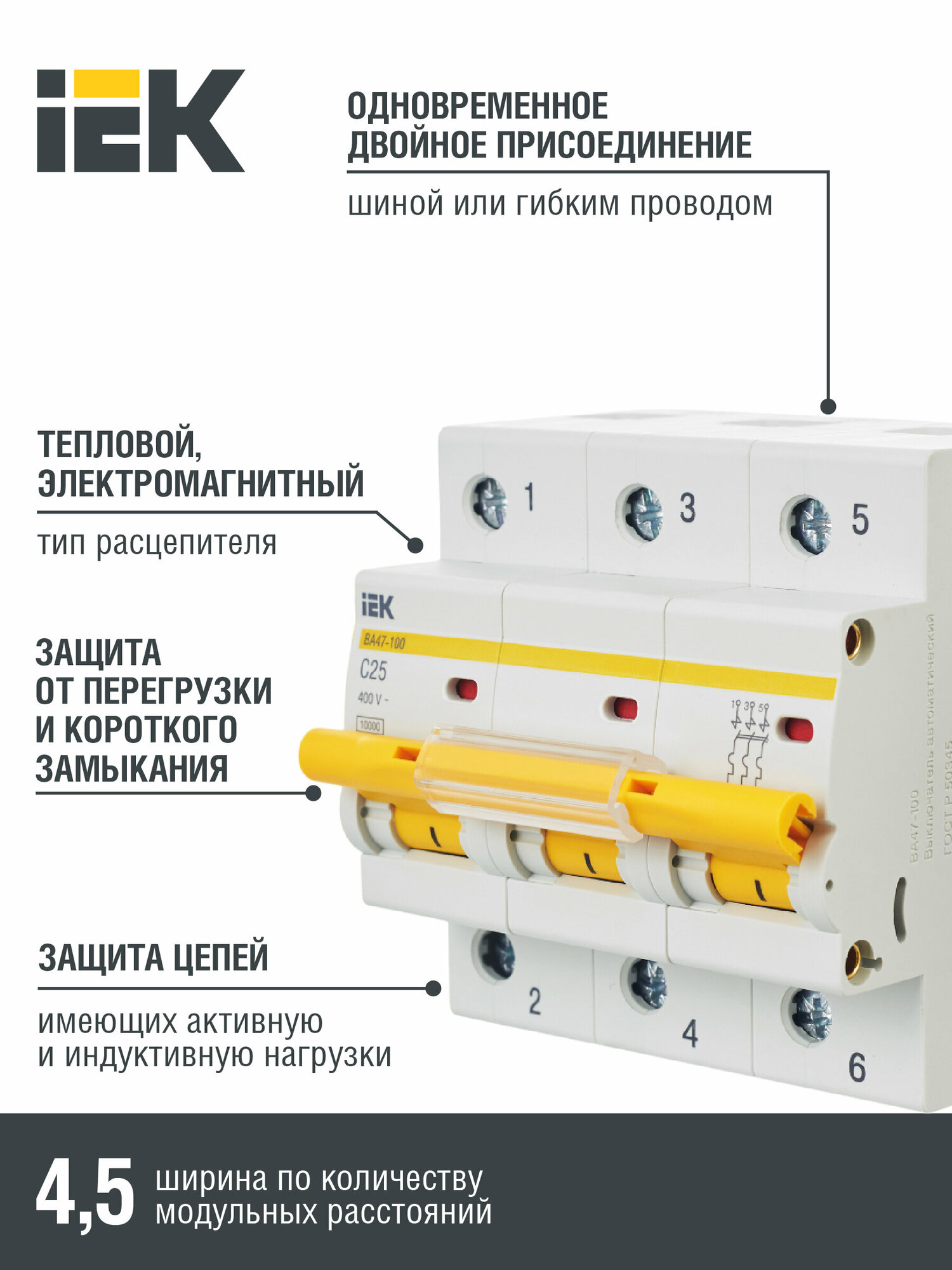 Выключатель автоматический трехполюсный ВА47-100 25А C 10кА MVA40-3-025-C IEK ( 1шт. ) информация: