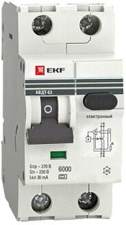 Выключатель автоматический дифференциального тока АД-32 63А (1P+N) двухполюсный характеристика C 4,5kA 30мА тип AC электронный PROxima DA32-63-30-pro EKF