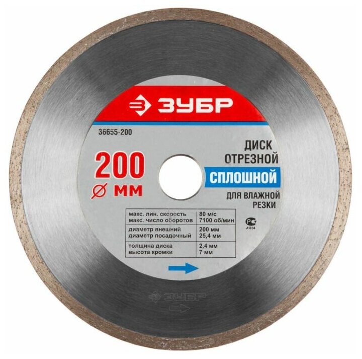 Зубр Диск алмазный отрезной ЗУБР КЕРАМО-25 200 мм, сплошной, керамогранит, плитка, мрамор, гранит (200х25.4 мм, 7х2.2 мм), 36655-200, серия Профессионал информация: