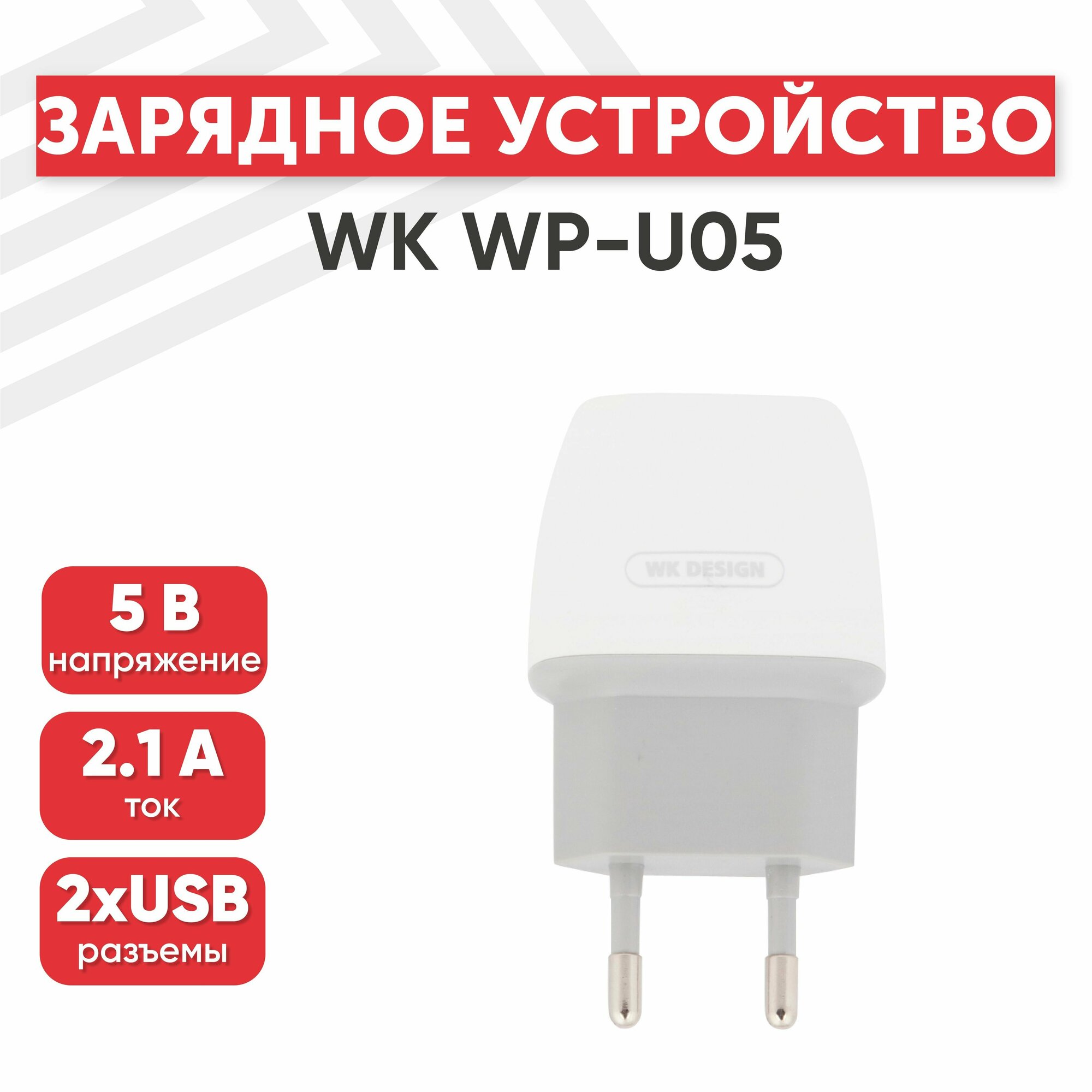 Сетевое зарядное устройство (адаптер) WK WP-U05, 2 USB выхода, 2.1А, 5В, белый информация: