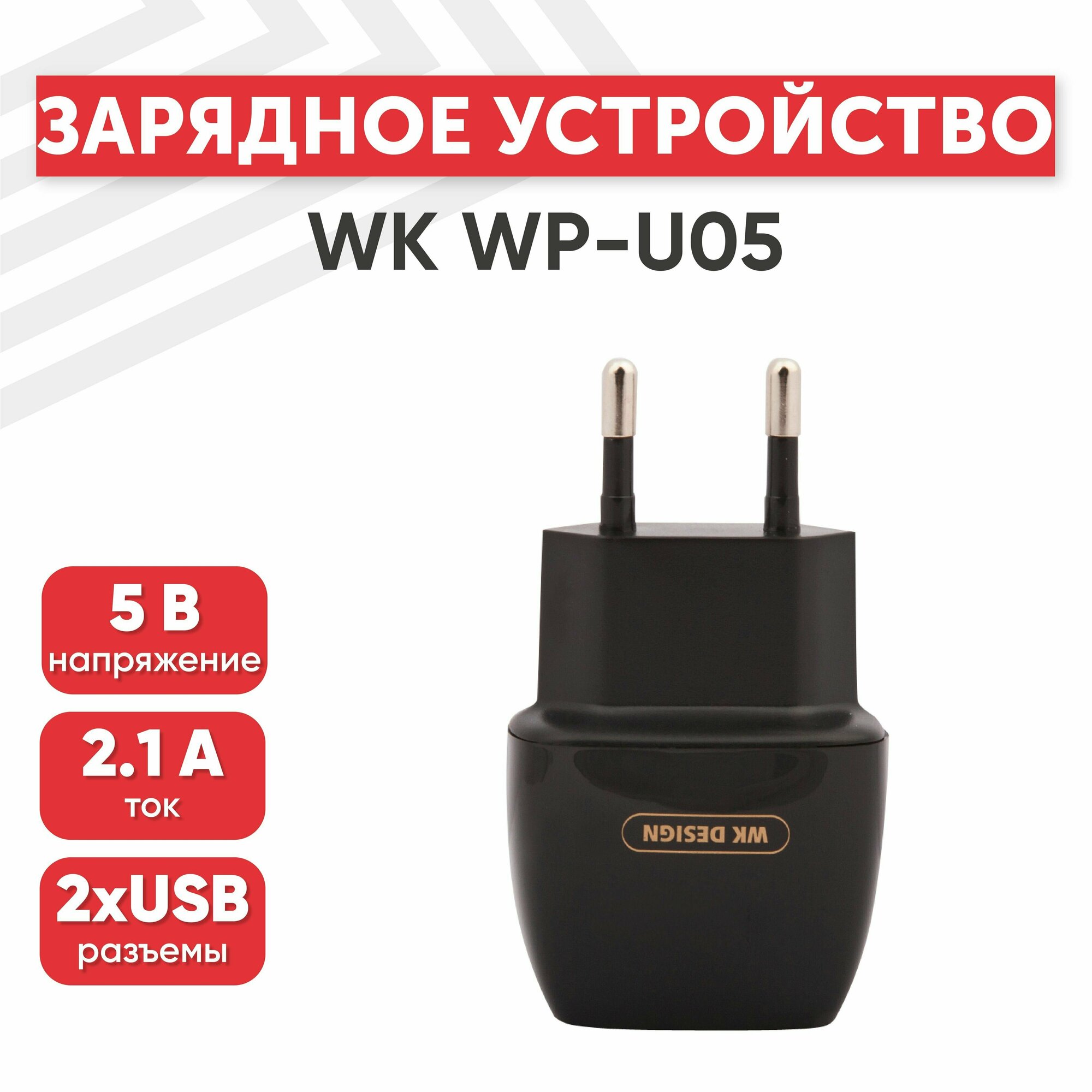 Сетевое зарядное устройство (адаптер) WK Caddy WP-U05, 2 порта USB-А, 2.1А, черный информация: