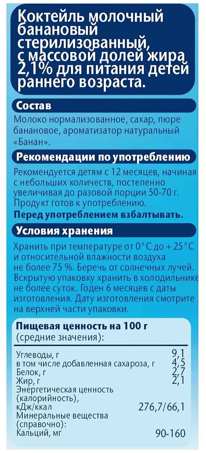 ФрутоНяня коктейль молочный банановый с 12 месяцев, 0,2 л, 3 шт информация: