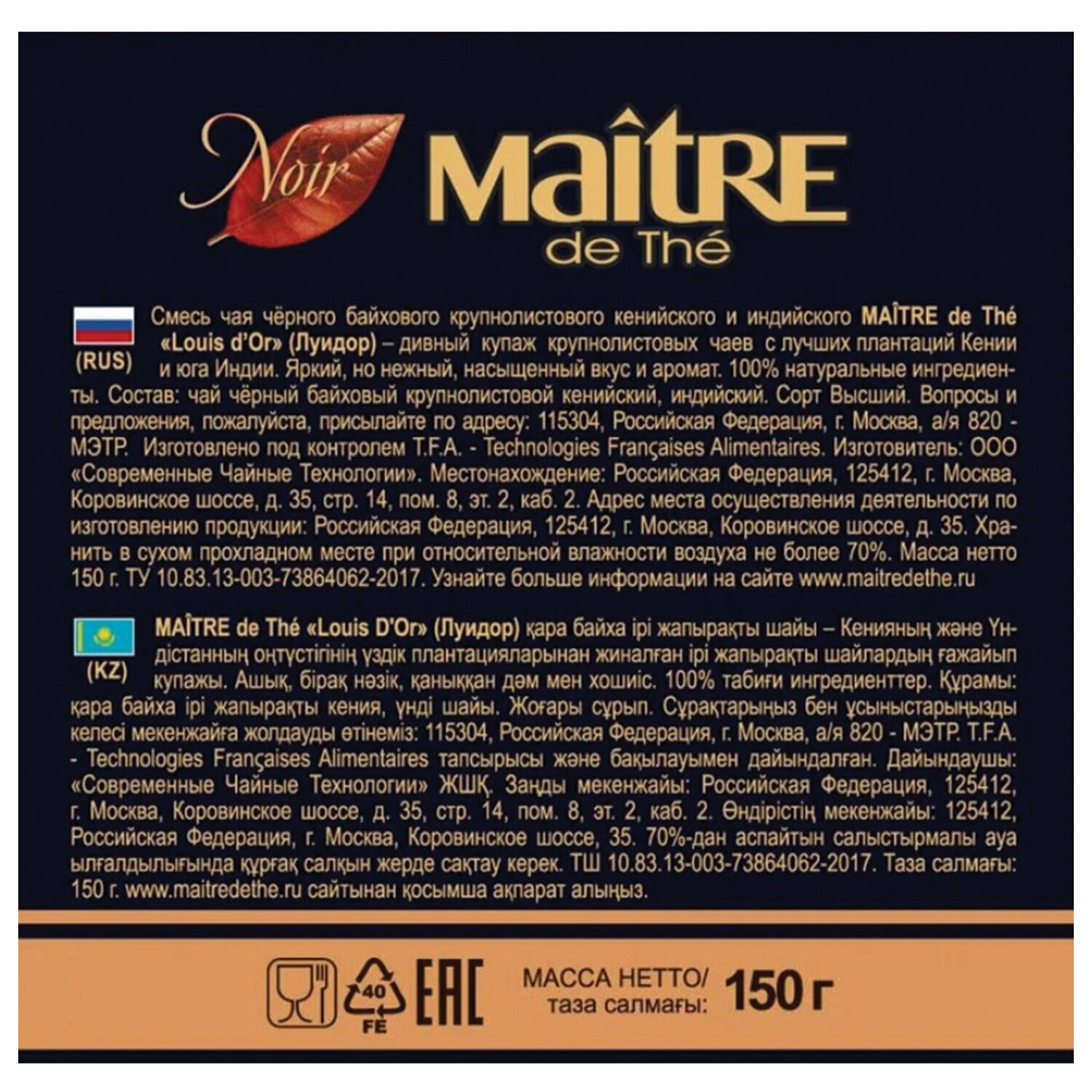 Чай MAITRE de Thé LOUIS d`OR смесь черного байхового крупнолистового кенийского и индийского 150 г, 1 жестяная банка