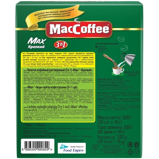 Кофейный напиток MacCoffee Max 3в1 Крепкий растворимый 20шт х 16г информация:
