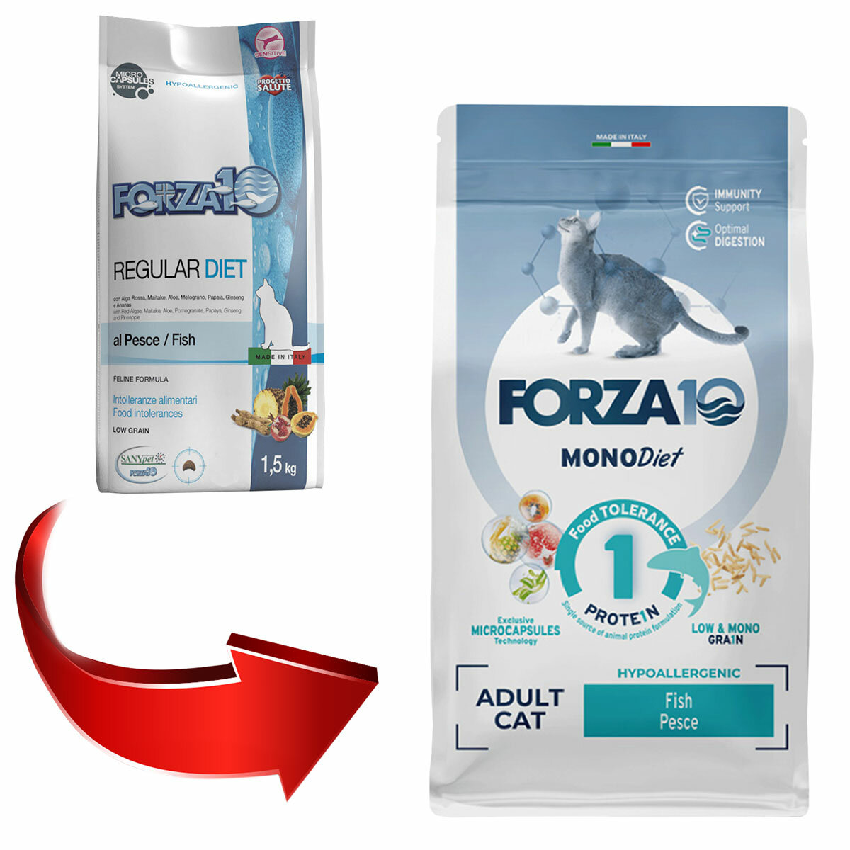 Forza10 MonoDiet Pesce сухой монобелковый корм для взрослых кошек при аллергии и повышенной чувствительности к животным белкам из океанической рыбы - 1,5 кг