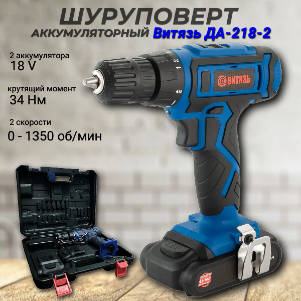 10 цен на Дрель-шуруповерт аккумуляторная 18В 2 скор. 2 акк. Li-ion 2,0Ач. 34Нм. 0-350/0-1350 об/мин. Кейс. заряд 2ч. ДА-218-2 Витязь