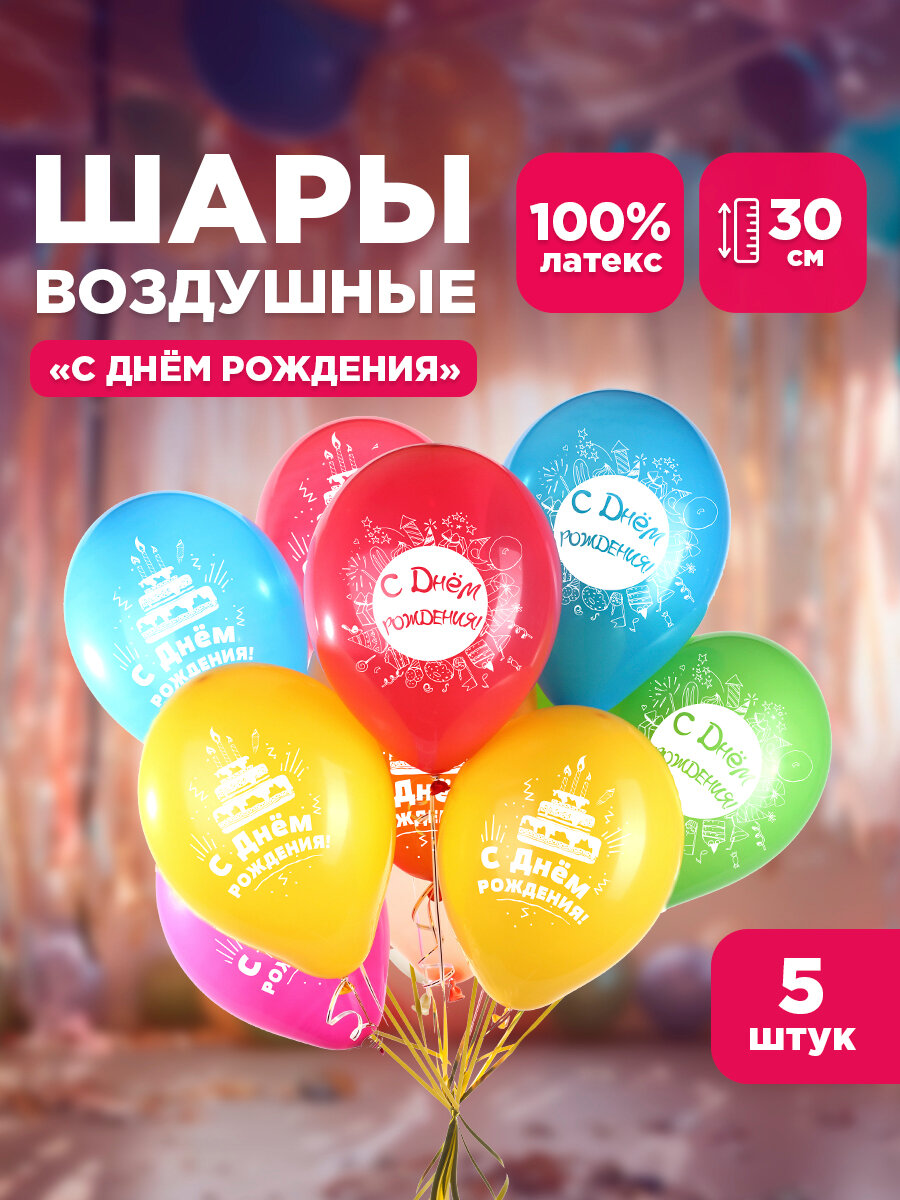 Воздушные шарики "С Днем Рождения!", 30 см, круглые, разноцветные с рисунком, 5 шт, PATERRA