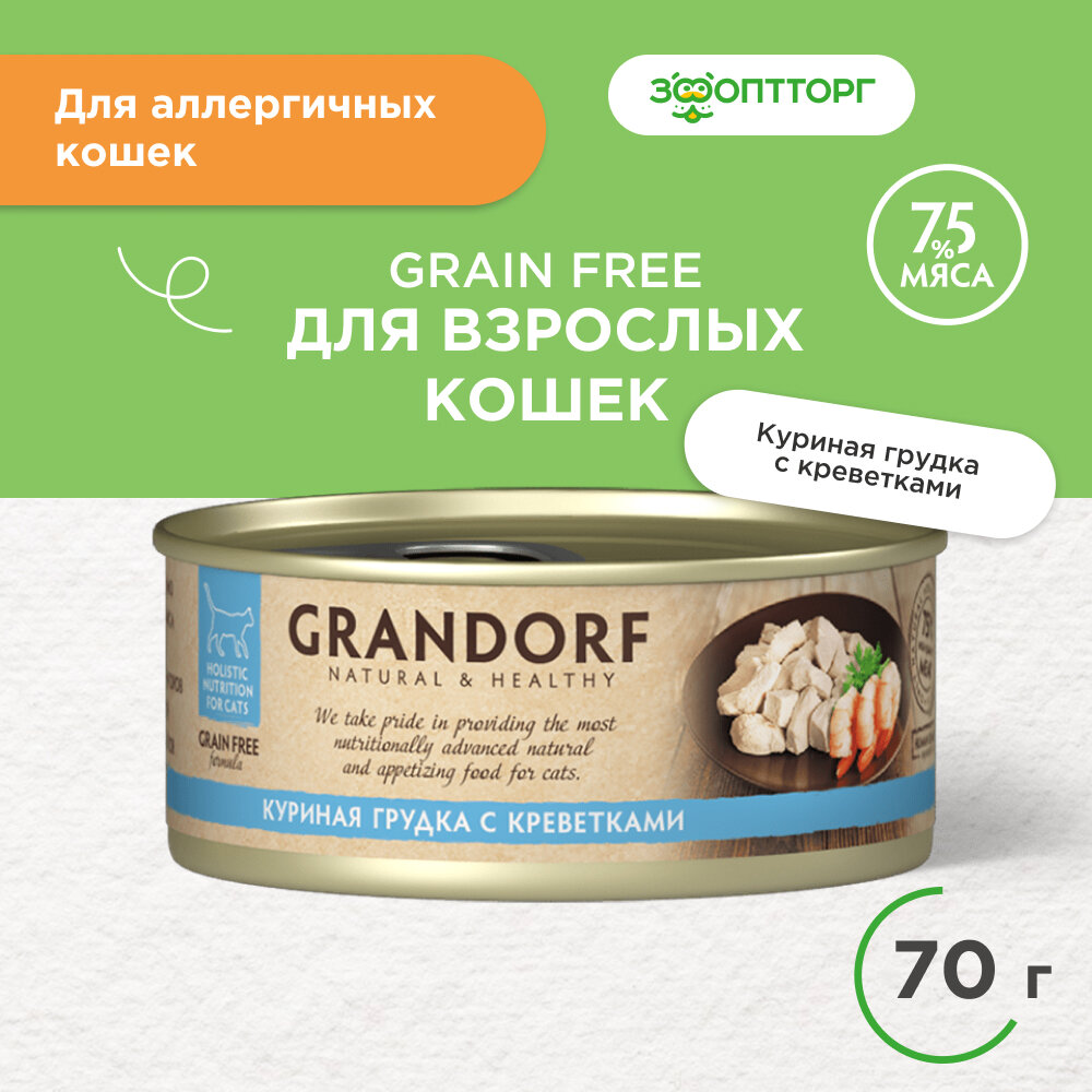 Влажный корм для взрослых кошек всех пород Grandorf, куриная грудка с креветками 70г, 1 банка информация: