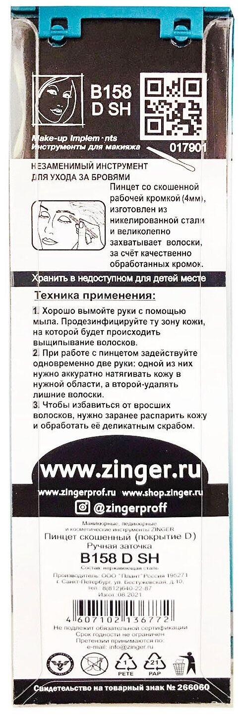 Пинцет для бровей Zinger B-158 D/FD, скошенный, с ручной заточкой, серебристый матовый информация: