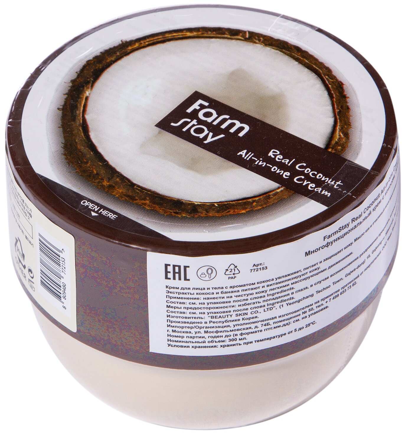 FarmStay Real Coconut All-in-one Cream Многофункциональный крем для ухода за кожей лица, шеи и зоны декольте с кокосом, корейская косметика. 300мл