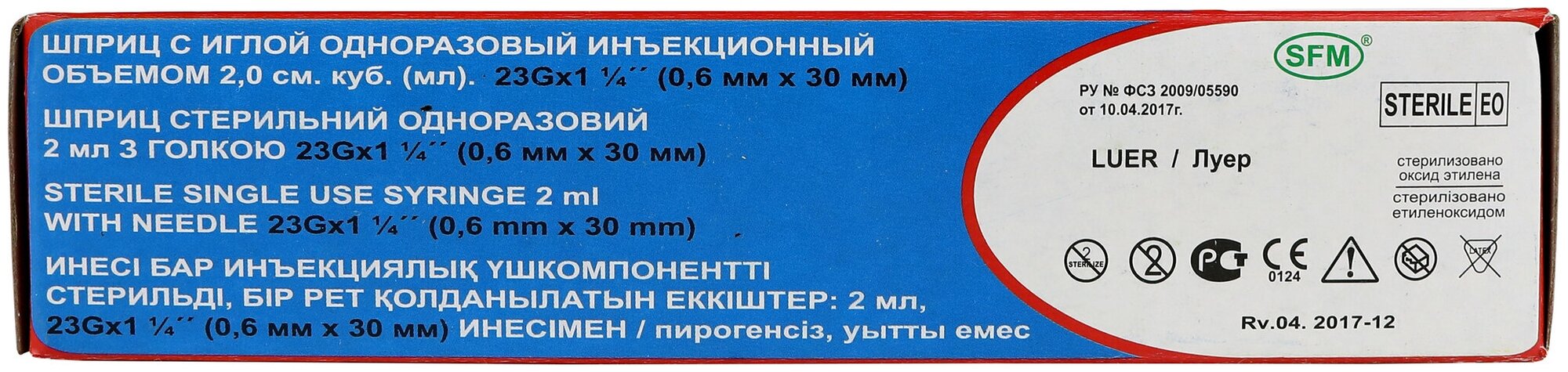 Шприц трехкомпонентный одноразовый инъекционный SFM с иглой (2 мл, 23G (0,60х30 мм), 100 шт, Luer) 782 ₽