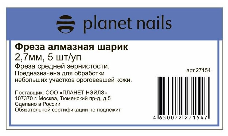 PLANET NAILS, Фреза алмазная шарик 2,7 мм, (5 шт/упак) информация: