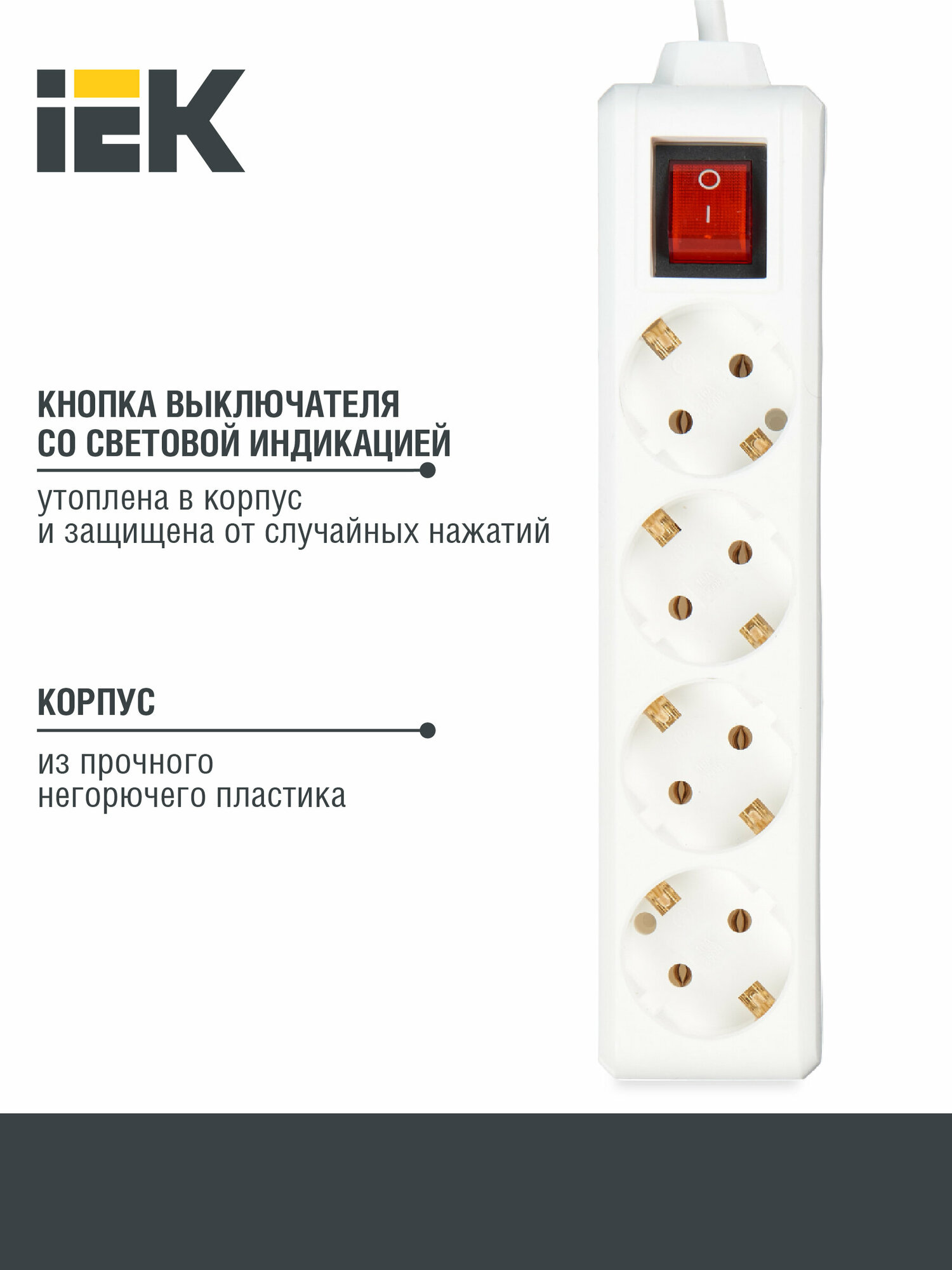 Удлинитель с выключателем IEK У04К-выкл, ПВС 3 x 1 мм², с заземлением, 4 розетки, 5 м, белый 553 ₽
