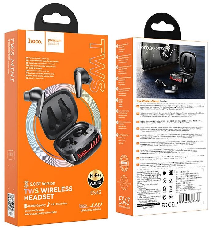 Наушники ES43 HOCO, беспроводные наушники капельки, черные информация: