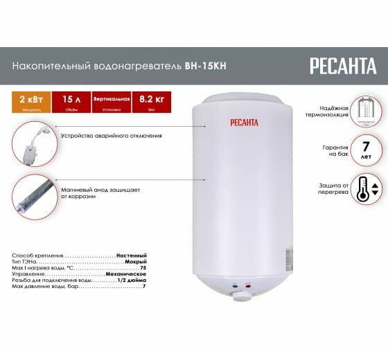 Водонагреватель накопительный ВН-15КН Ресанта, арт. 74/5/12