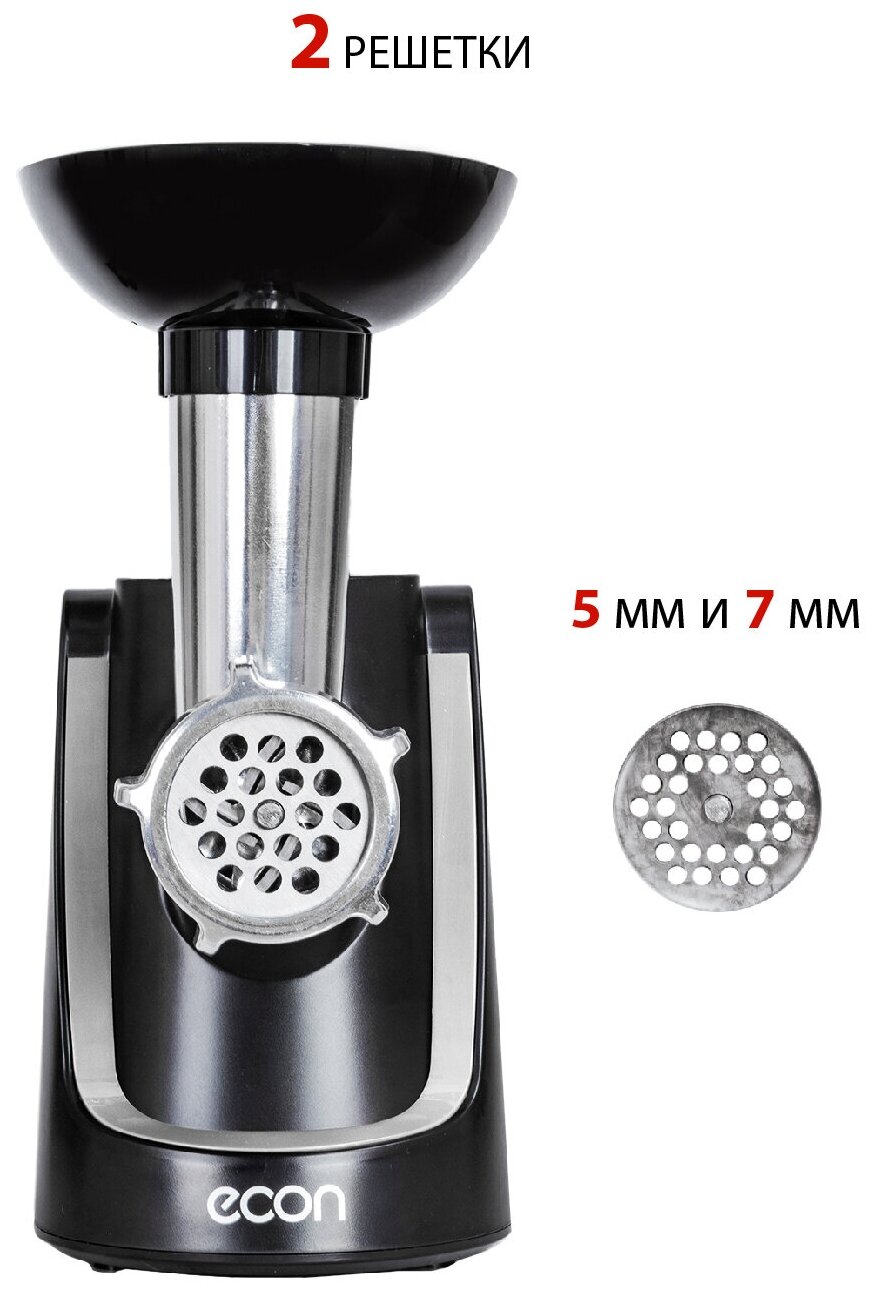 Мясорубка электрическая Econ с 2 насадками-овощерезками и решетками 5 и 7 мм, производительность 1,8 кг/ мин, реверс, 1600 Вт
