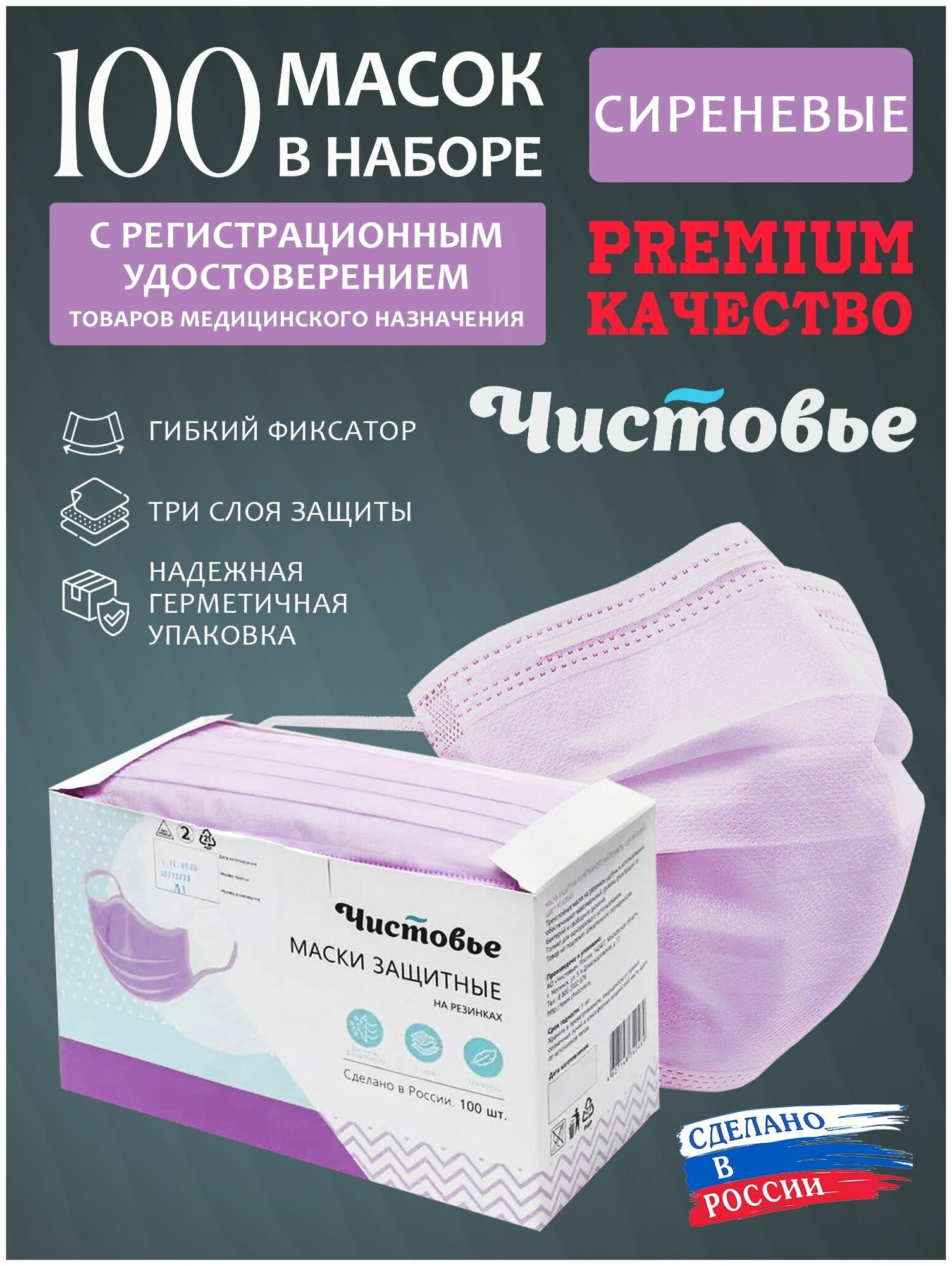 Маска медицинская одноразовая “чистовье” (трехслойная, на резинках, сиреневая) 100 шт/упак