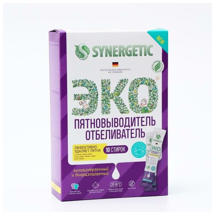 Отбеливатель-пятновыводитель Synergetic с активным кислородом, гипоаллергенный, биоразлагаемый, 10 стиков