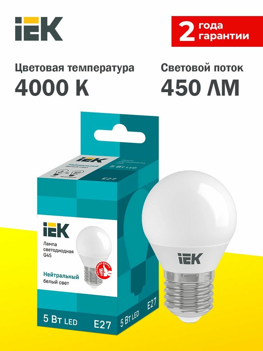 (20 шт.) Светодиодная лампочка IEK шар G45 E27 5W(450lm) 4000K 4K 78x45 матов. ECO LLE-G45-5-230-40-E27 . Цоколь E27 3 419 ₽