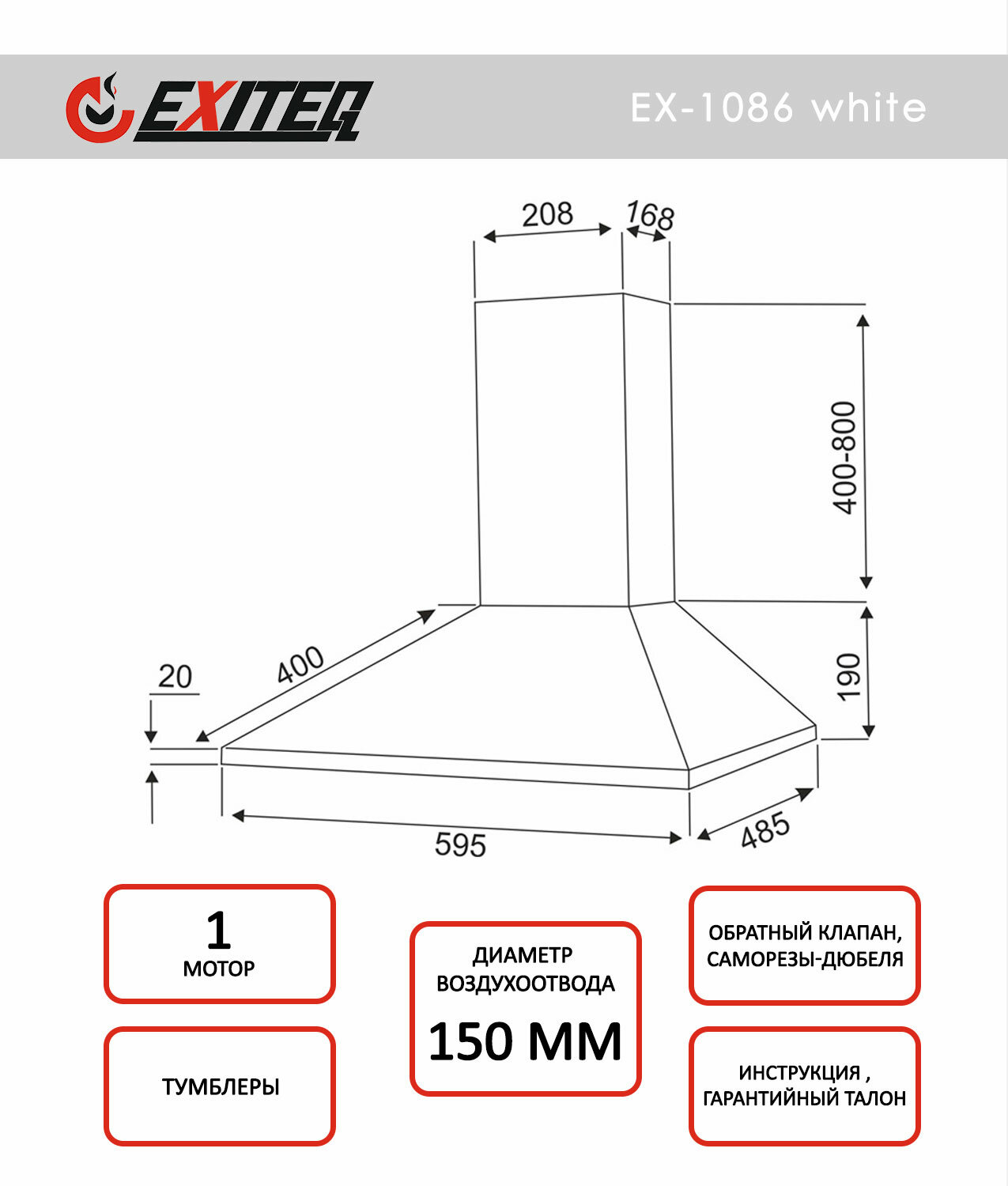 Каминная вытяжка Exiteq EX-1086 white 12 230 ₽