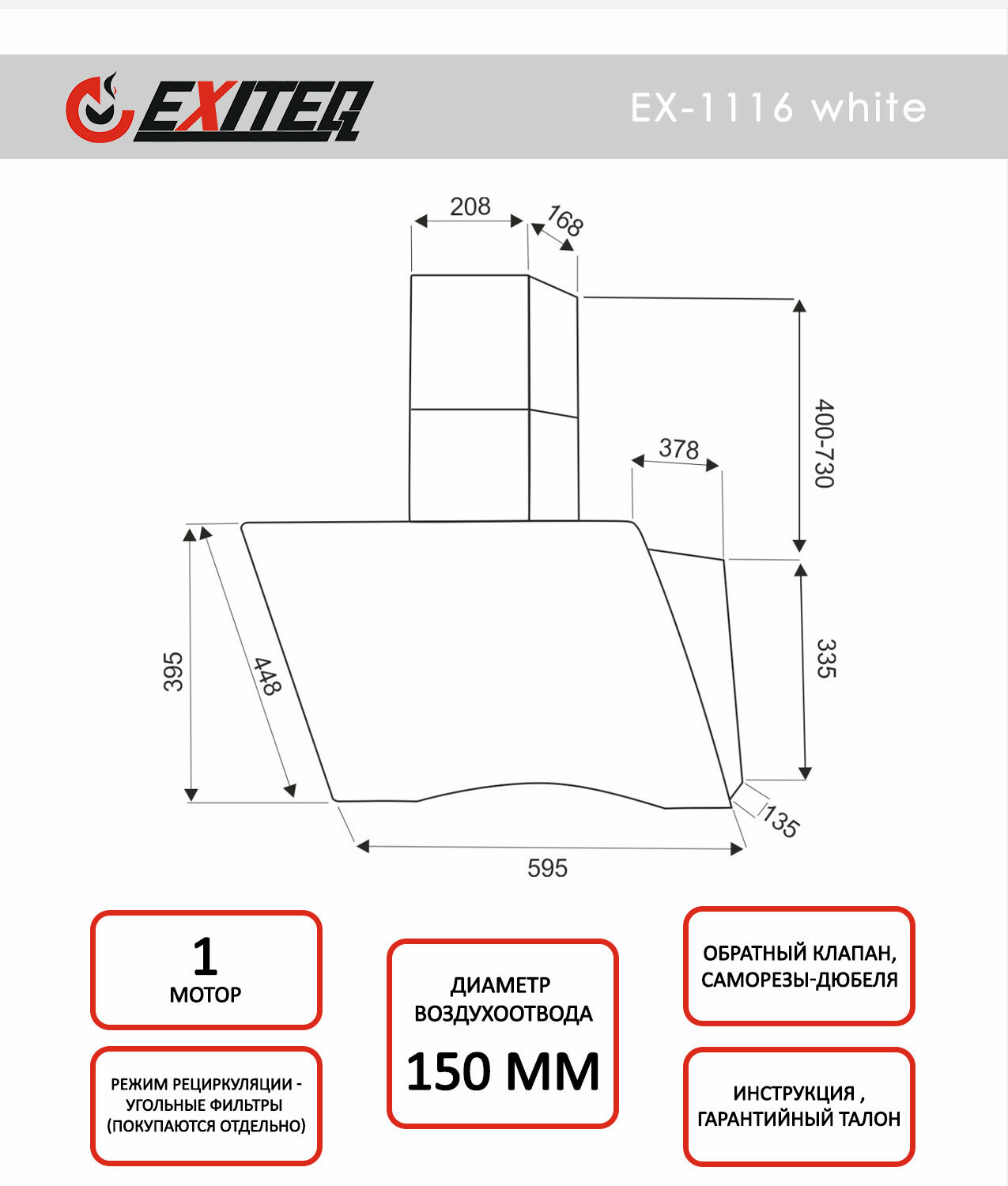 Наклонная вытяжка EXITEQ EX-1116, цвет корпуса white, цвет окантовки/панели белый информация: