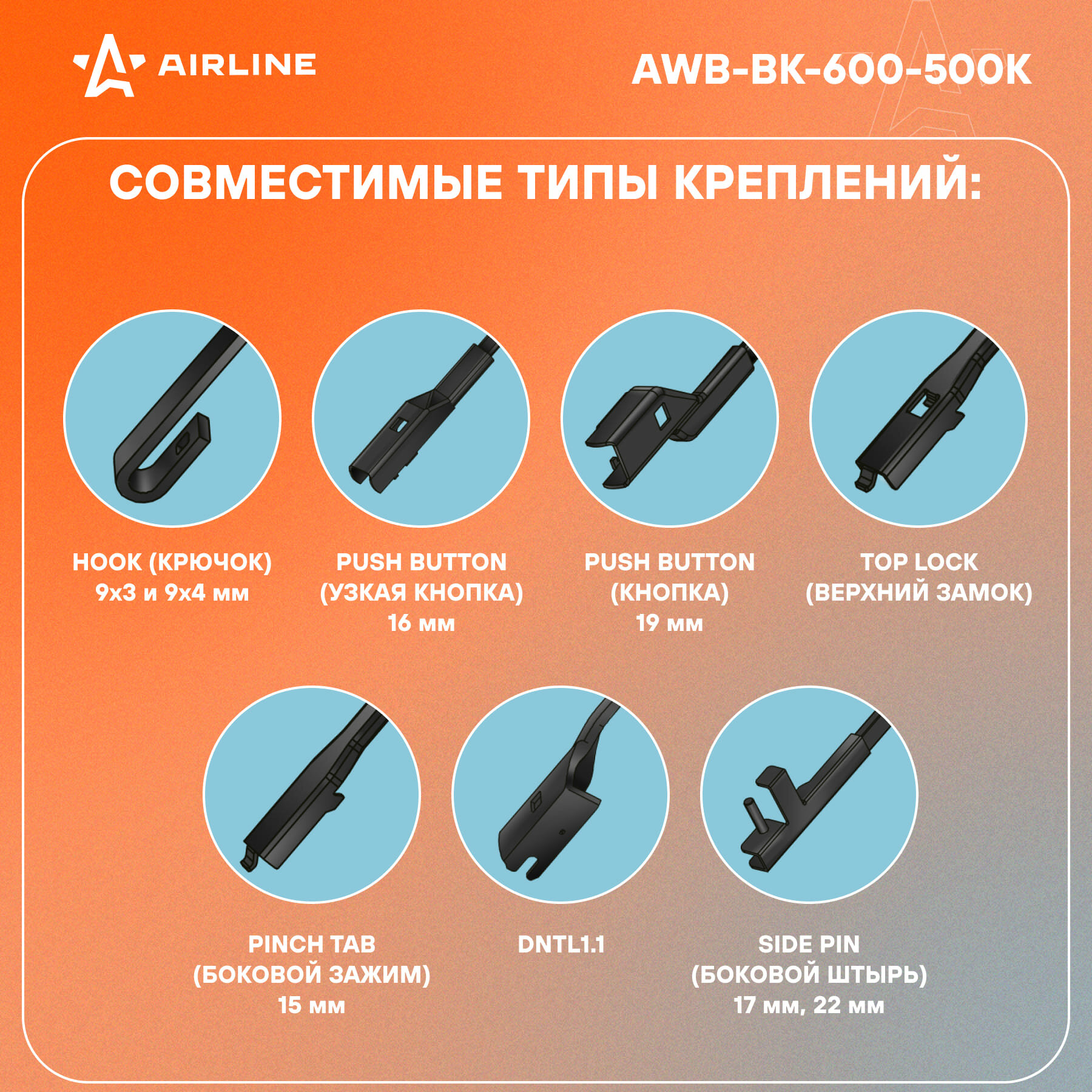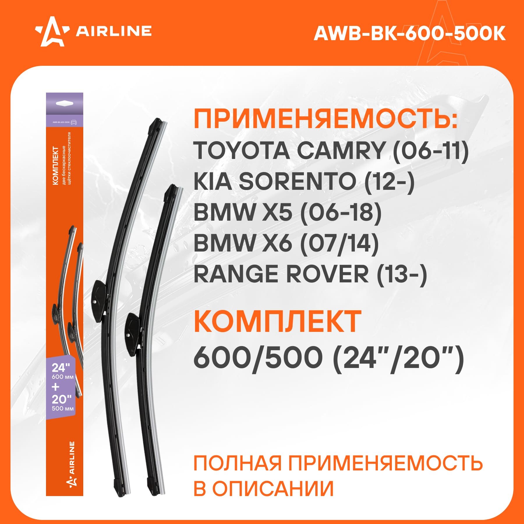 Щетки стеклоочистителя 600/500мм (24"/20") бескаркасные для а/м Toyota Camry (06-11), Kia Sorento (12-), BMW X5 (06-18), X6 (07/14), Range Rover (13-), 2 шт. 6 типов адптр AWB-BK-600-500K AIRLINE информация: