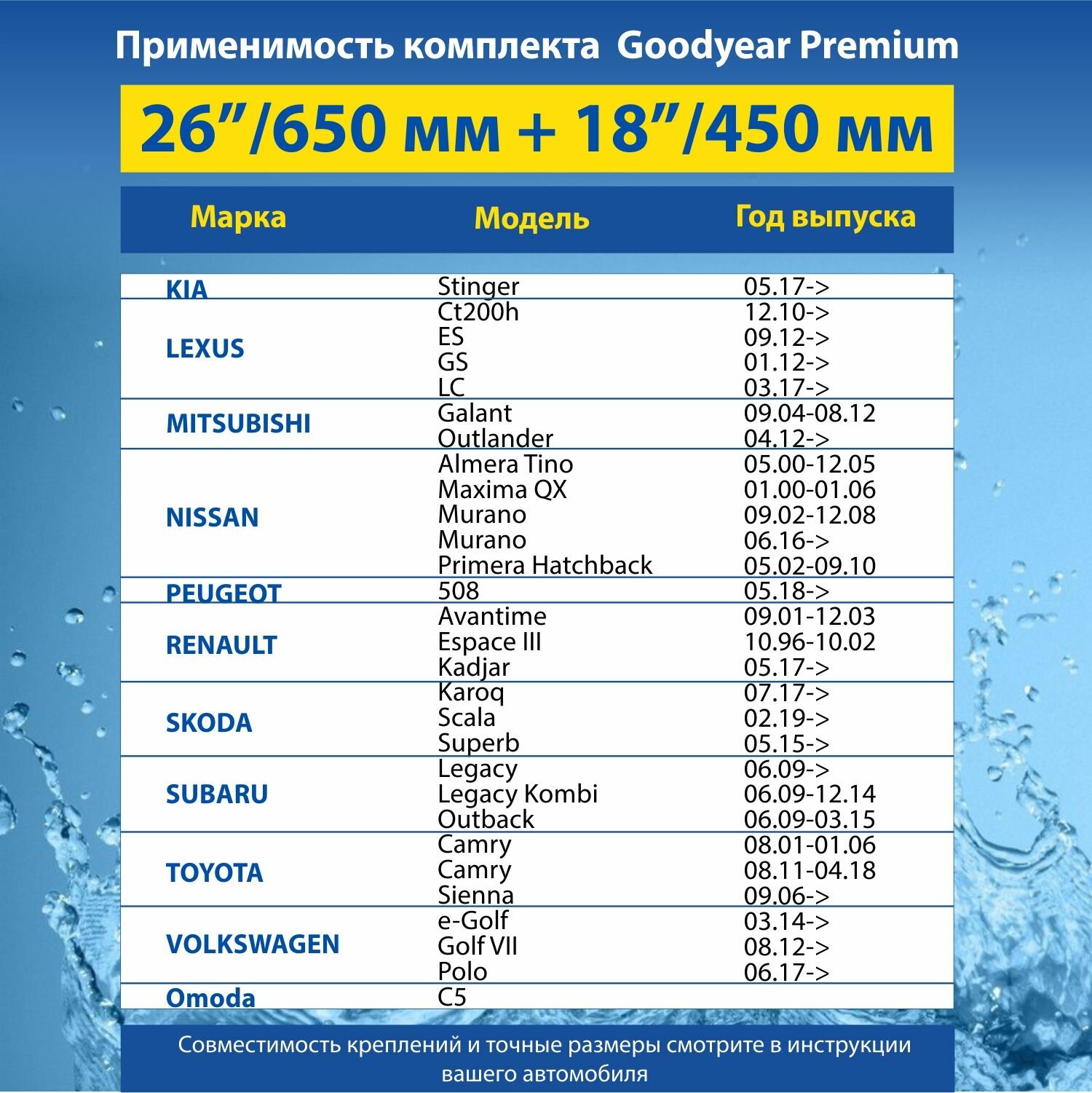 2 Щетки стеклоочистителя в комплекте (65+45 см), Дворники для автомобиля GOODYEAR для SKODA Karoq(17-нв)/Superb(15-нв), NISSAN Murano(16-нв) информация: