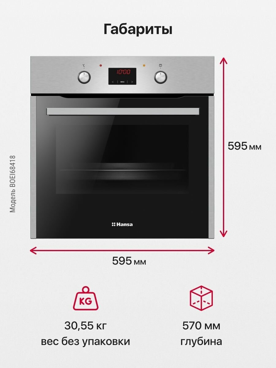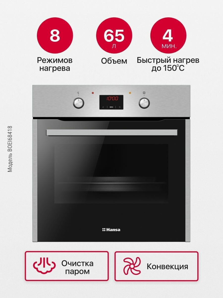 Электрический духовой шкаф Hansa встраиваемый BOEI68418, 60 см, с грилем и улучшенной конвекцией, с быстрым нагревом, с таймером, двойное жаропрочное стекло информация: