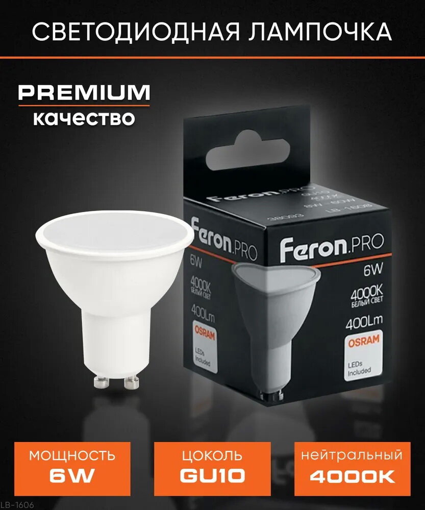 Светодиодная лампа FERON PRO LB-1606 GU10 6W 4000K OSRAM LED 38087