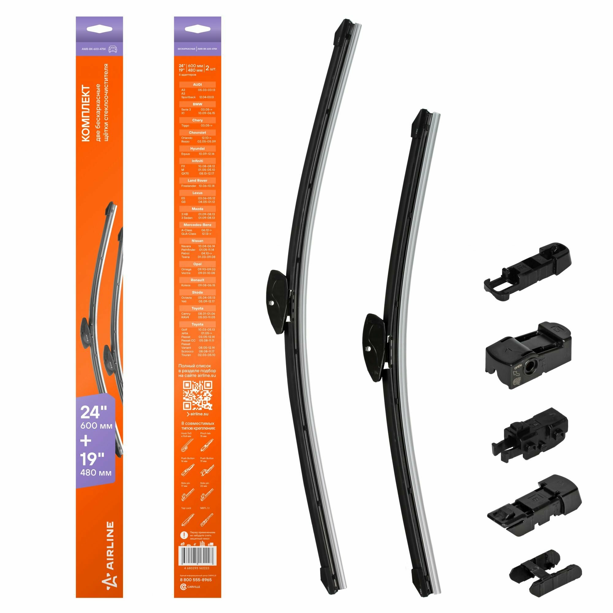 Щетки стеклоочистителя 600/475мм (24"/19") бескаркасные,BMW3 05-,X1 09/15,TIGGO 05-,Octavia 04/13,Yeti 09/17,Camry 01/06,Golf03/05,08/13,CLA 13-,2 шт. 6 адптр AIRLINE