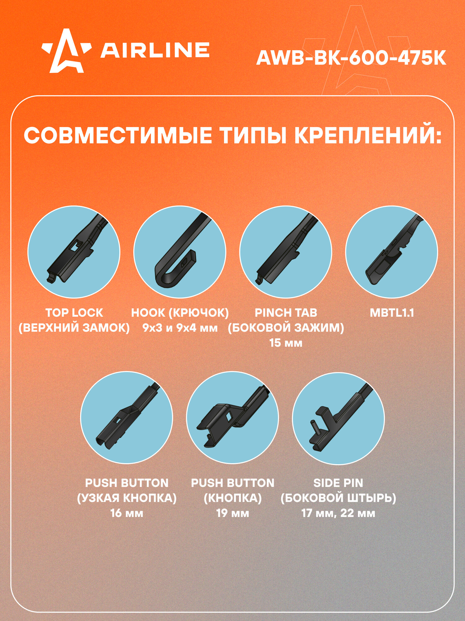 AIRLINE AWBBK600475K Щетки стеклоочистителя 600/475 мм (24"/19") бескаркасные, 6 адаптеров (компл. 2 шт.)