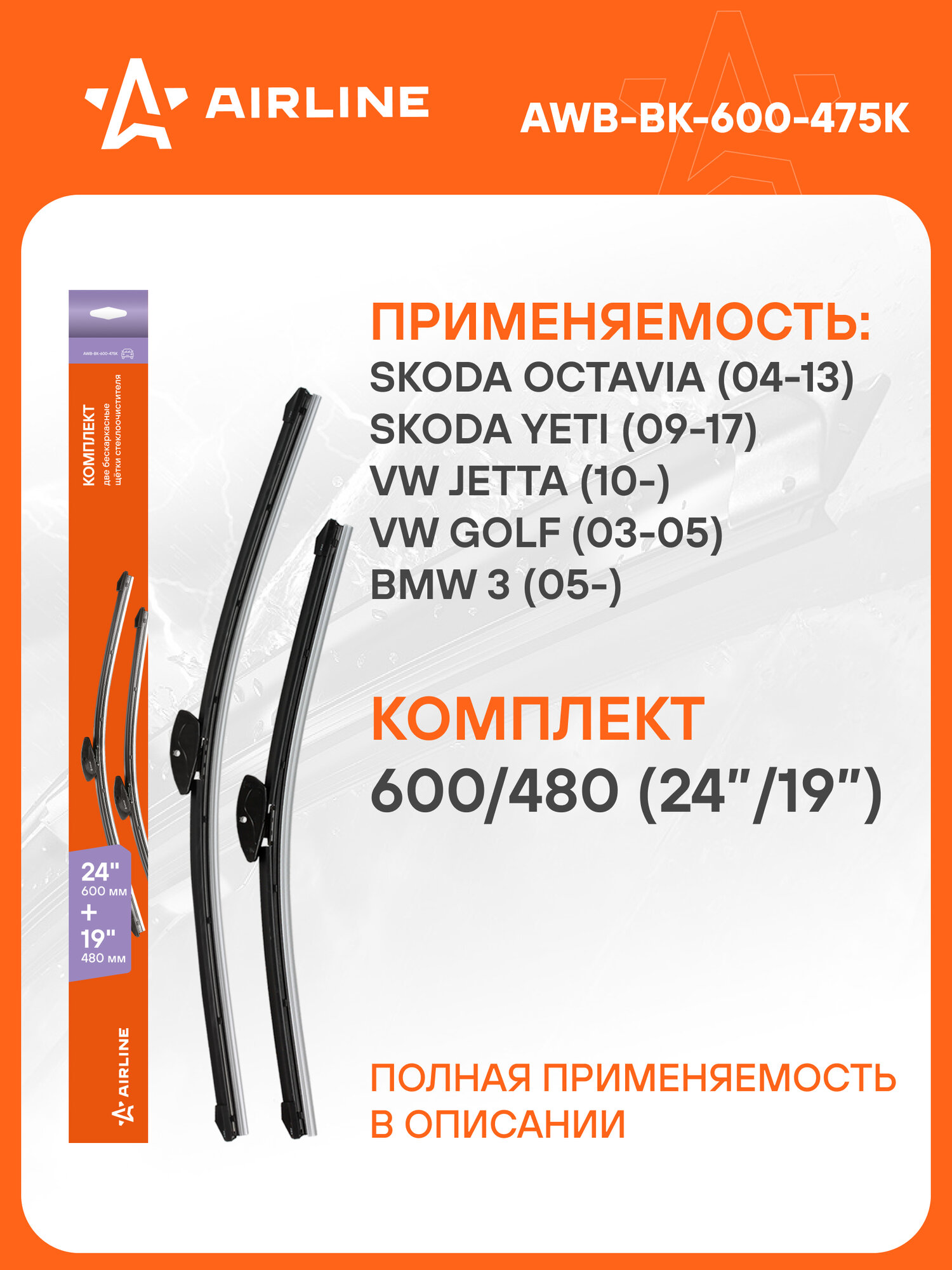 Щетки стеклоочистителя 600/480мм (24"/19") бескаркасные для а/м Skoda Octavia (04-13), Yeti (09-17), Volkswagen Jetta (10-), Golf (03-05), BMW 3 (05-), 2 шт. 6 типов адптр AWB-BK-600-475K AIRLINE информация: