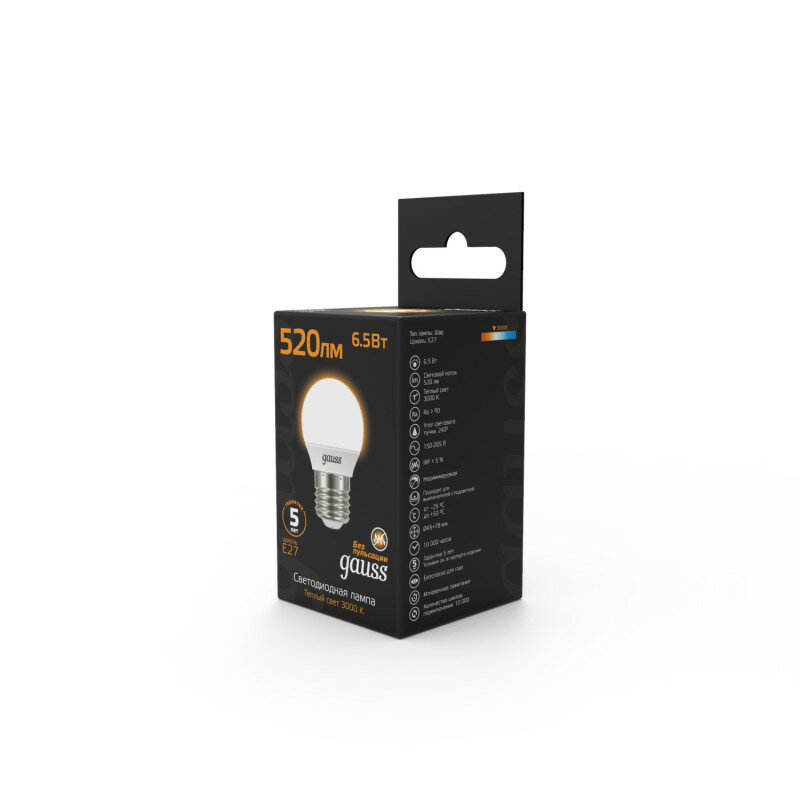 Светодиодная лампа Gauss "Шар" 6.5Вт 520Лм Е27 3000К информация: