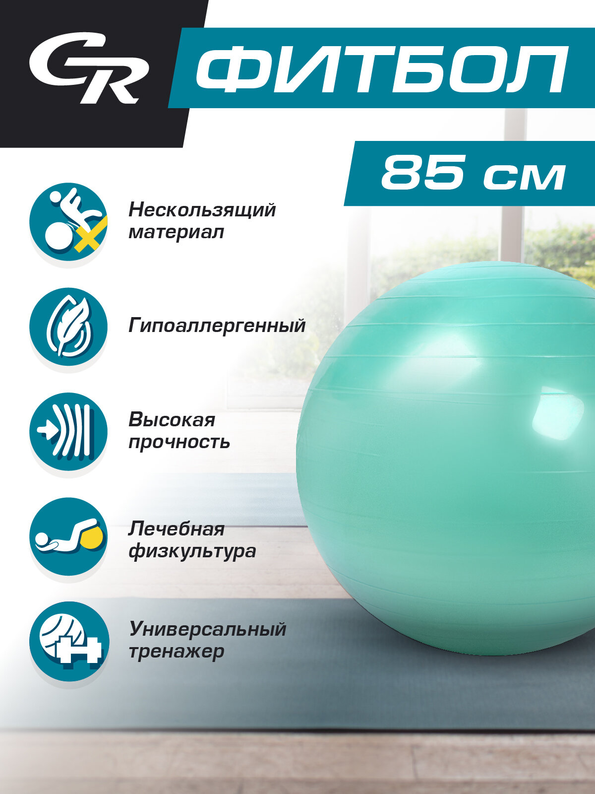 Мяч гимнастический, фитбол, для фитнеса, для занятий спортом, диаметр 85 см, ПВХ, мятный информация: