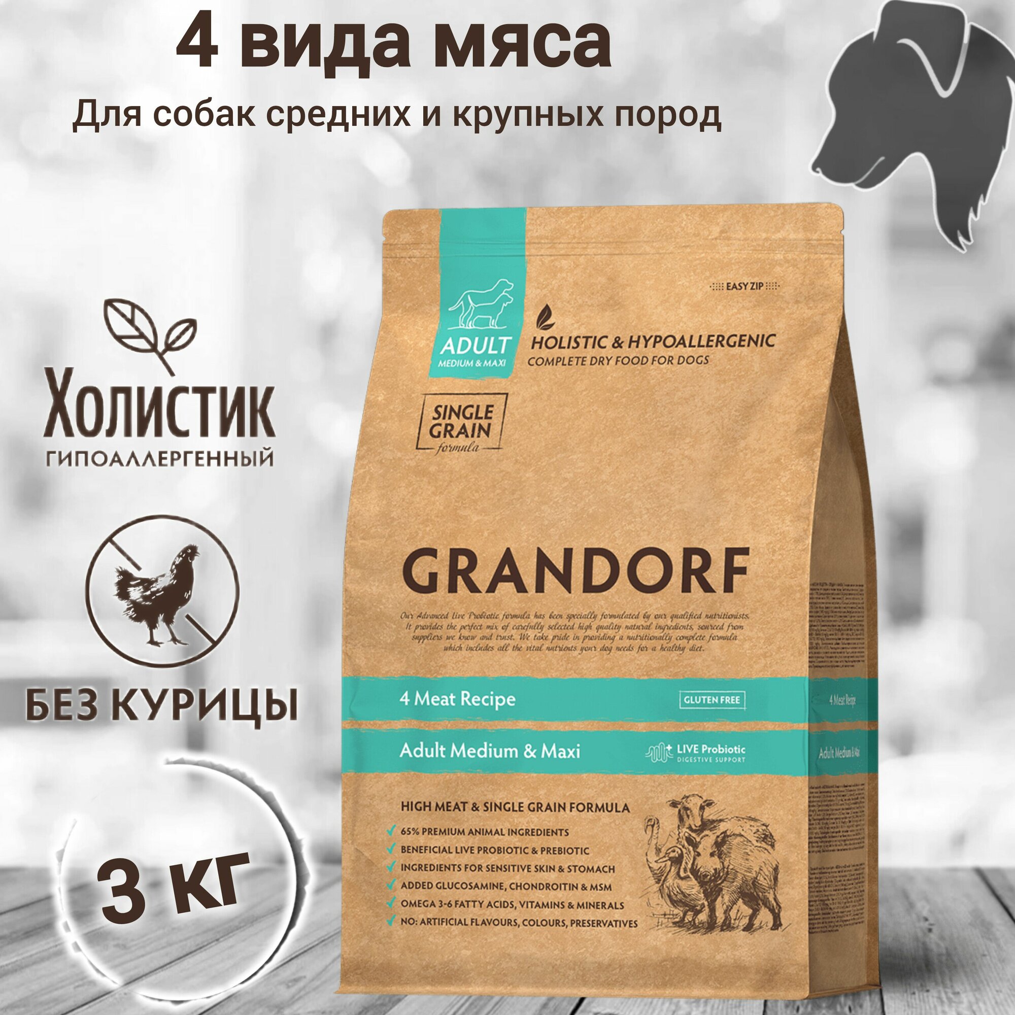 Корм GRANDORF 4 Мяса 3 кг. Для собак средних и крупных пород от 1 года. (4 Meat Adult Medium & Maxi). С пробиотиками, гипоаллергенный.