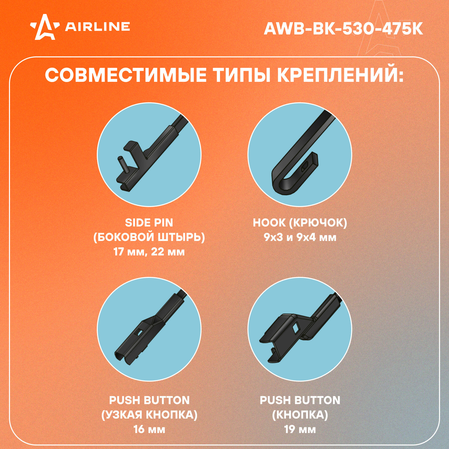 Щетки стеклоочистителя 530/475мм (21"/19") бескаркасные,Polo 01/09, Golf 91/04,Forester 97/07,L200 05/15, Mazda 3 03/08 2 шт. 4 типа адптр AWB-BK-530-475K AIRLINE