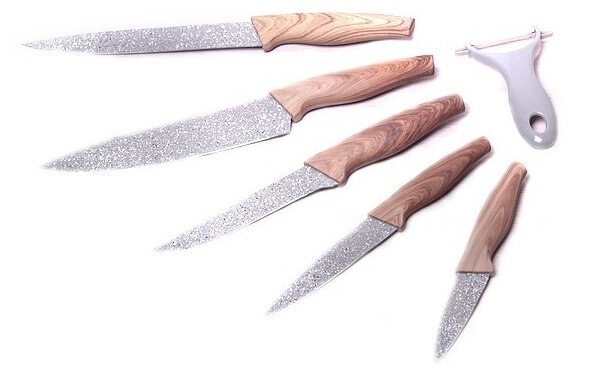 | Комплектация | нож "Шеф-повар" (20 см); нож для нарезки (20 см); нож для костей (15 см); нож универсальный (12,5 см); нож для чистки овощей (9 см); овощечистка (пиллер). |