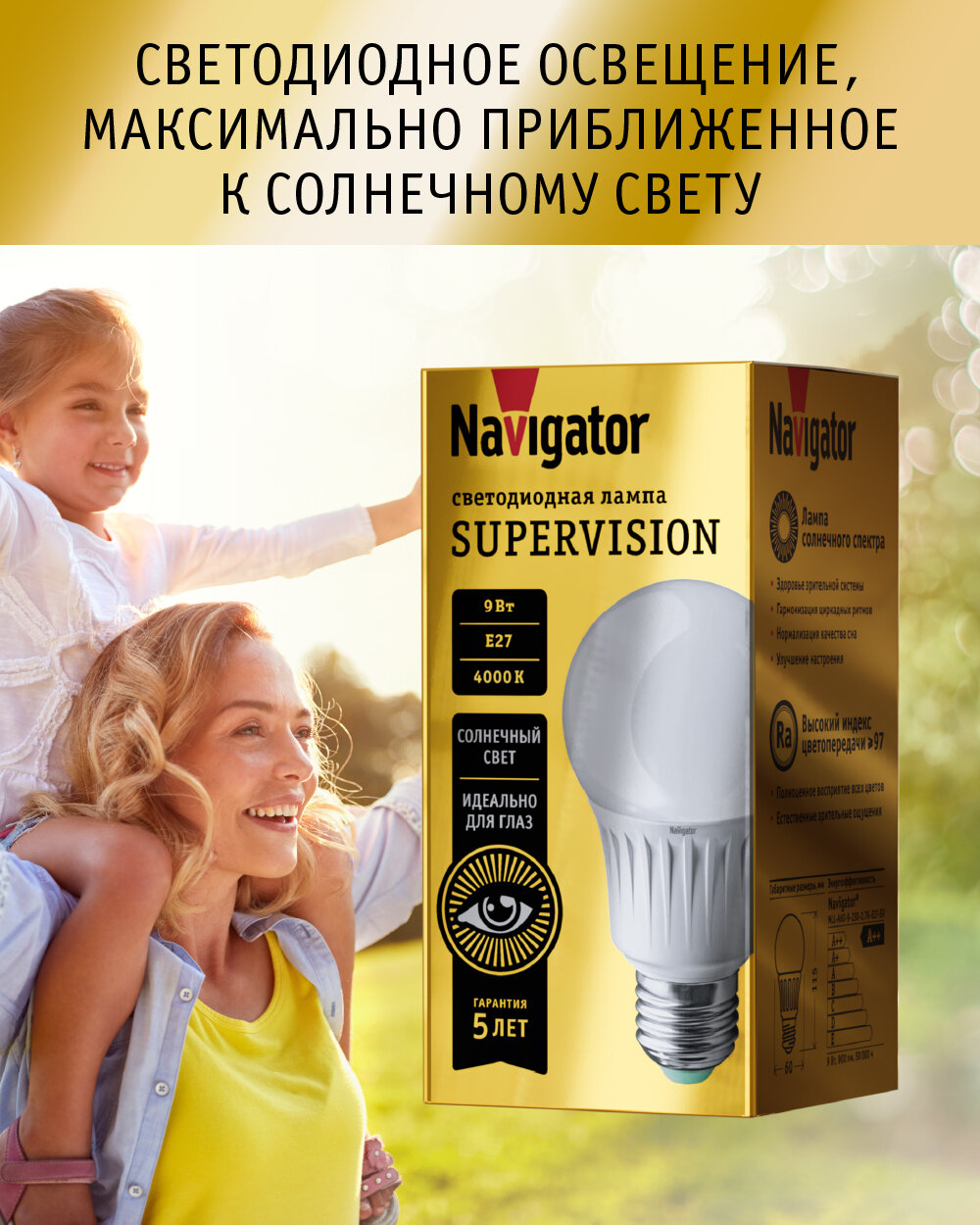 Лампа светодиодная солнечного спектра Navigator Supervision Е27, 9 Вт, груша, дневного света 4000К информация: