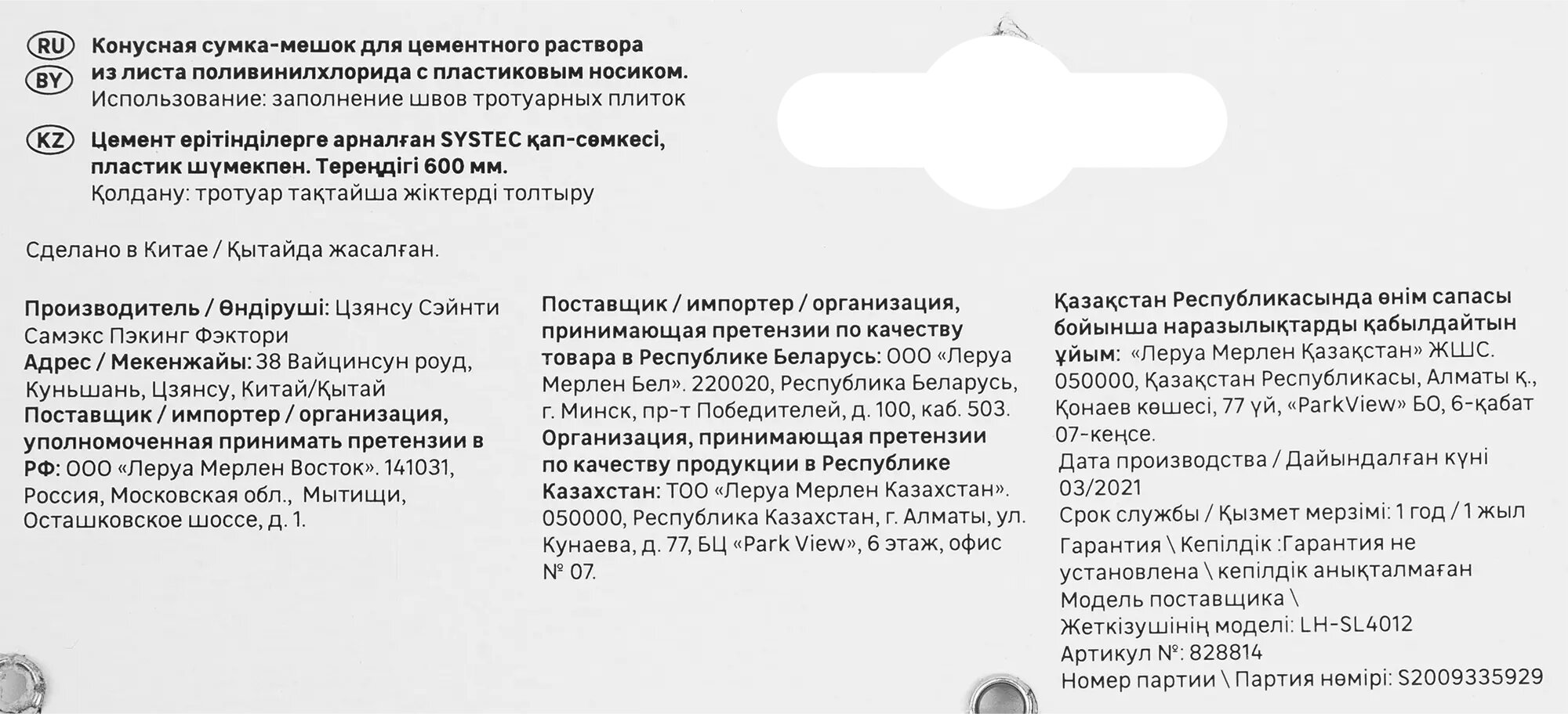 | Тип | мешок для нанесения затирки |