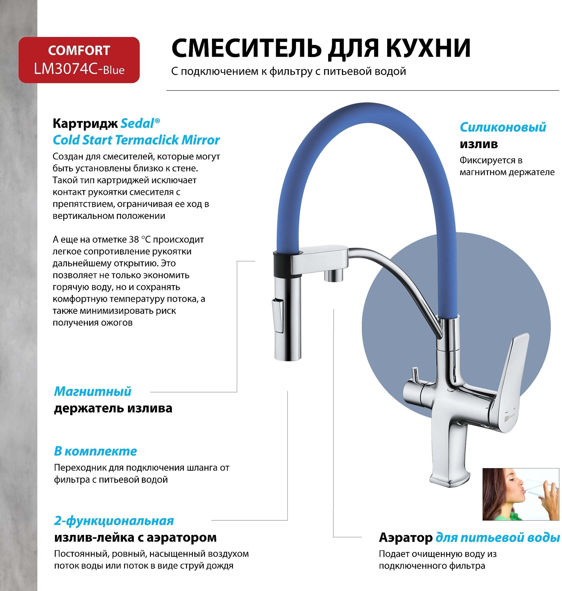 Смеситель для кухни с подключением к фильтру с питьевой водой Lemark Comfort LM3074C-Blue информация: