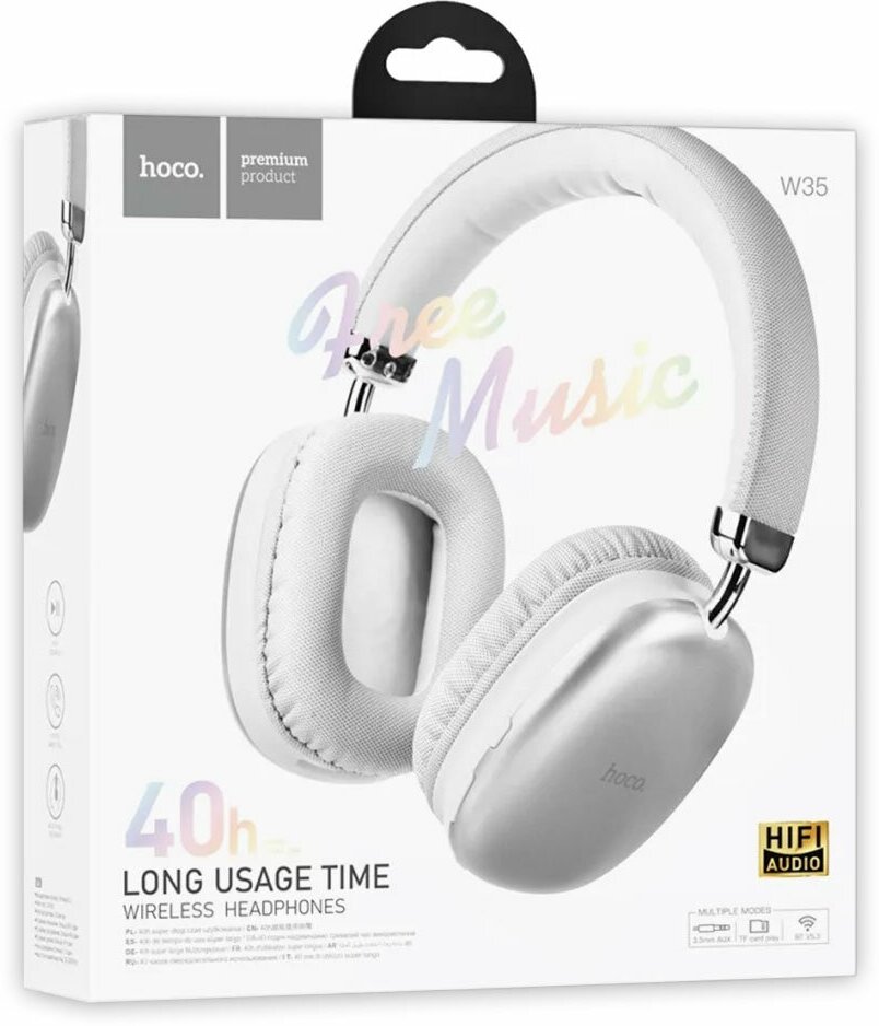 Отзывы на Беспроводные накладные наушники Hoco W35, Bluetooth 5.3, 40 часов работы, AUX, TF, Серебристый + Белый