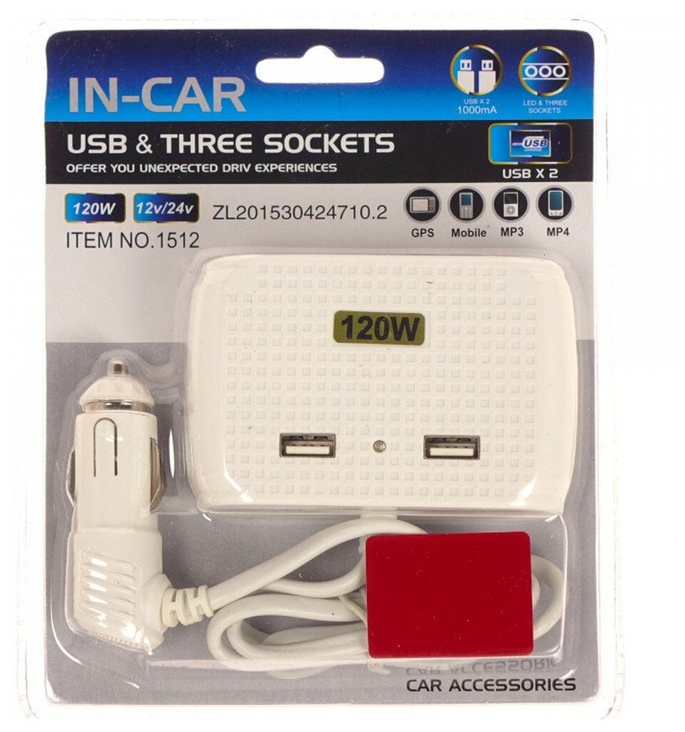 Автомобильный разветвитель прикуривателя IN-CAR 1512 /3 гнезда + 2 USB / 120W информация: