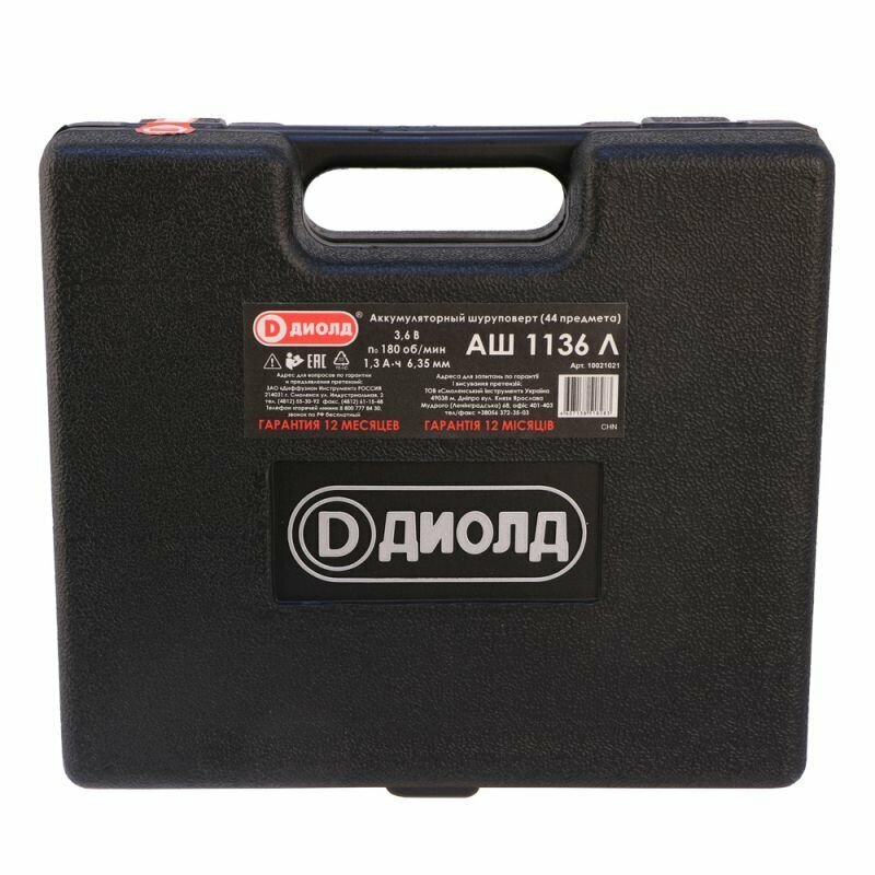 Аккумуляторный шуруповерт (отвертка) Диолд АШ-1136 Л (44 предмета), 180 об/мин, кейс, АКБ, блок питания информация:
