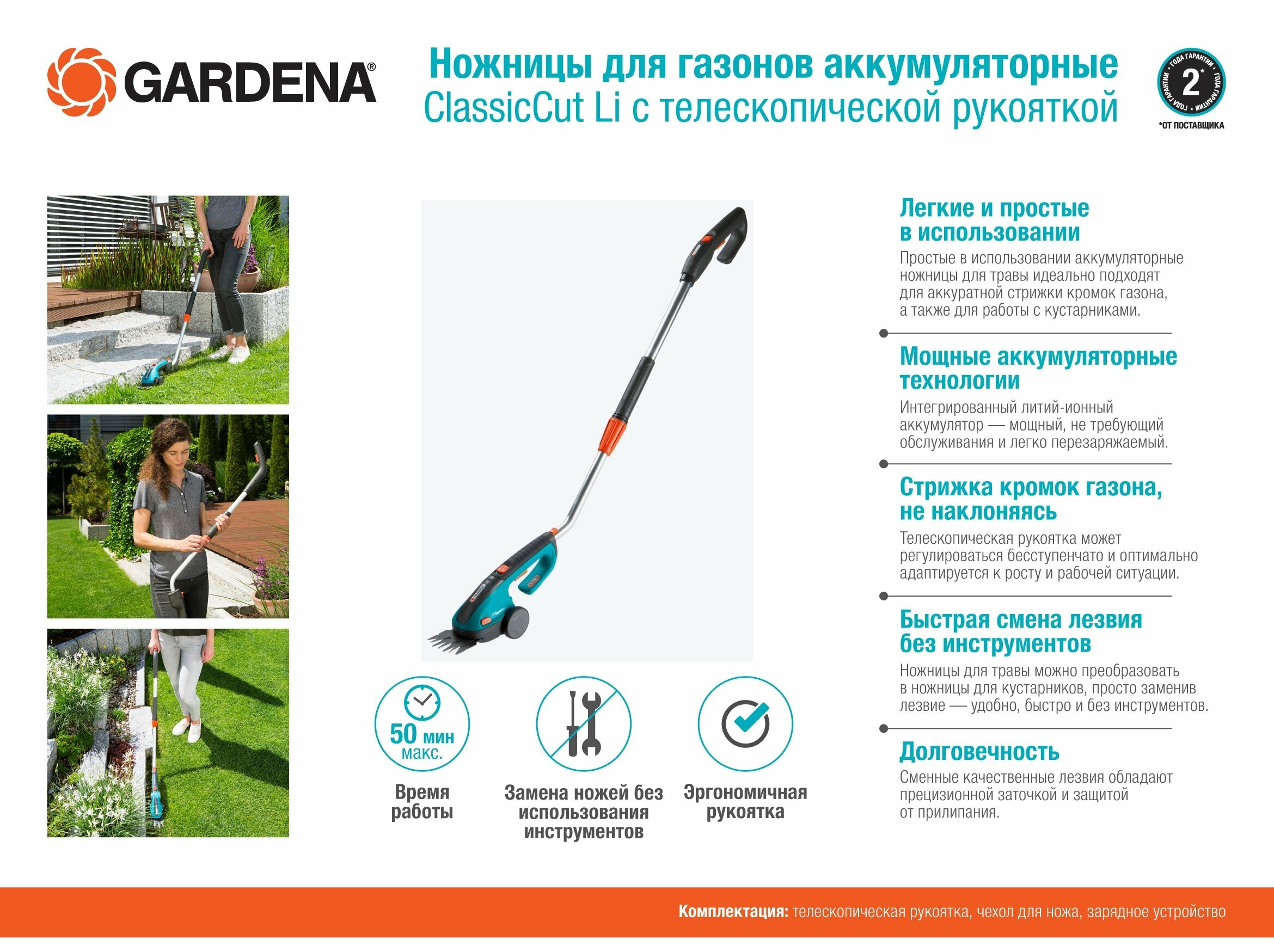 Комплект аккумуляторных газонных ножниц Gardena ClassicCut Li с телескопической рукояткой 09855-20.000.00 информация: