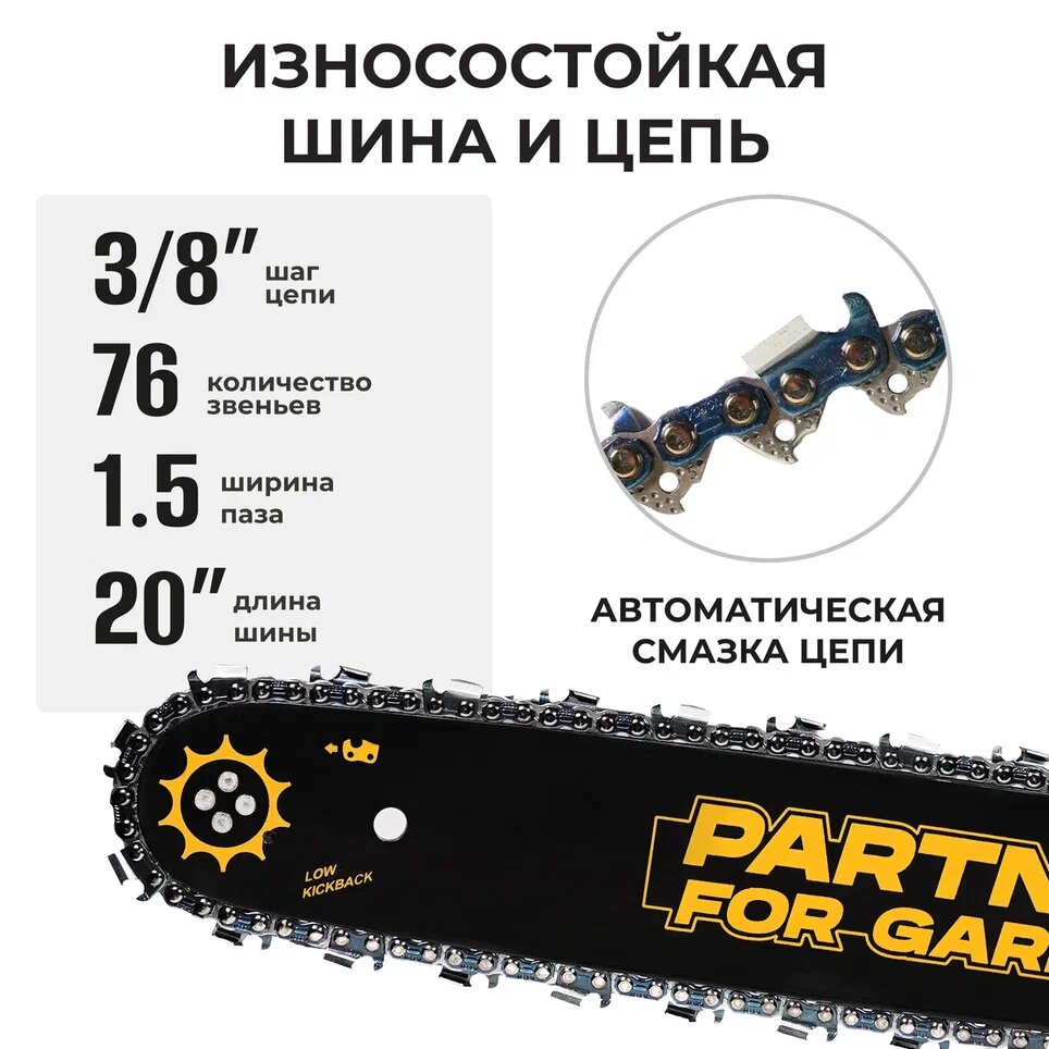 Бензопила цепная Partner for Garden GS 520 бензиновая 3,5 л.с, мощность 2,4 кВт, объем двигателя 49,3 см3 , длина шины 20" - 50 см информация: