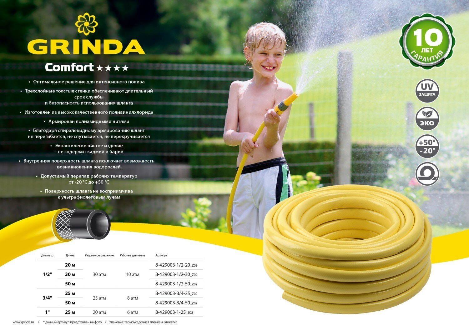 10 цен на GRINDA COMFORT 3/4", 25 м, 25 атм, трёхслойный поливочный шланг, армированный