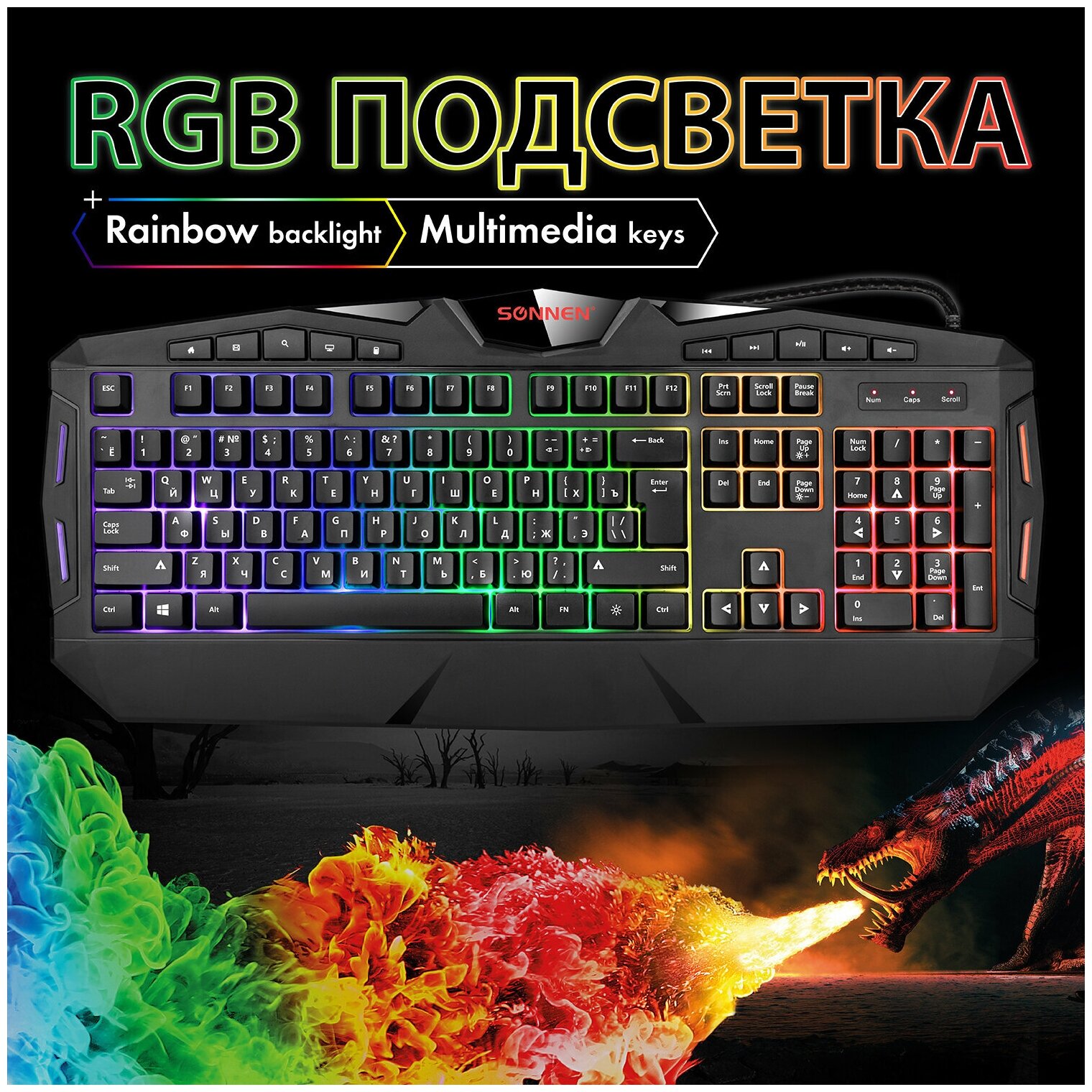 Клавиатура проводная игровая SONNEN Q9M, USB, 104 клавиши + 10 мультимедийных, RGB, черная, 513511 (арт. 513511) информация: